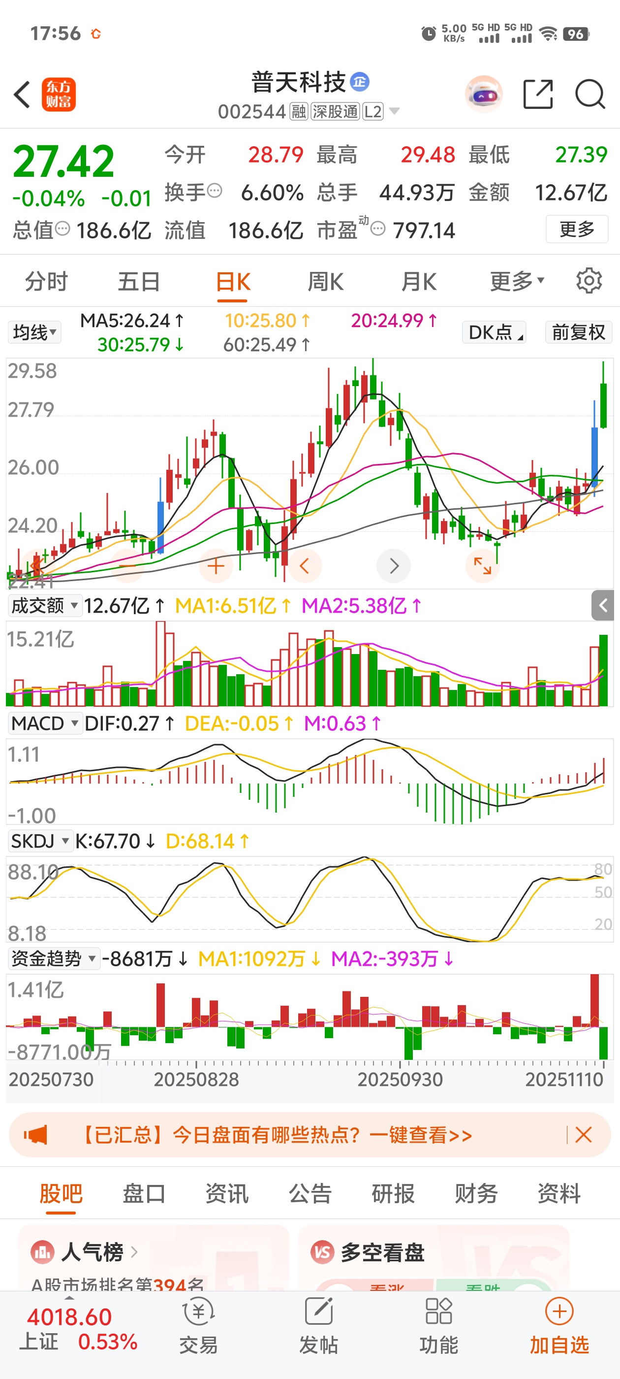 $普天科技(SZ002544)$ 对切左边的高点,这点量肯定过不去啦,至少还要2根今天这样的量才有可能过去,或者直接来个板锁住套牢盘也行,但是方向已经清晰了,态度也很明确了,安心拿着吧