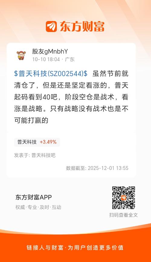 $普天科技(SZ002544)$ 虽然节前就清仓了,但是还是坚定看涨的,普天起码看到40吧,阶段空仓是战术,看涨是战略。只有战略没有战术也是不可能打赢的