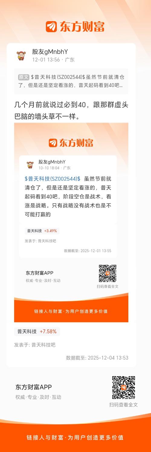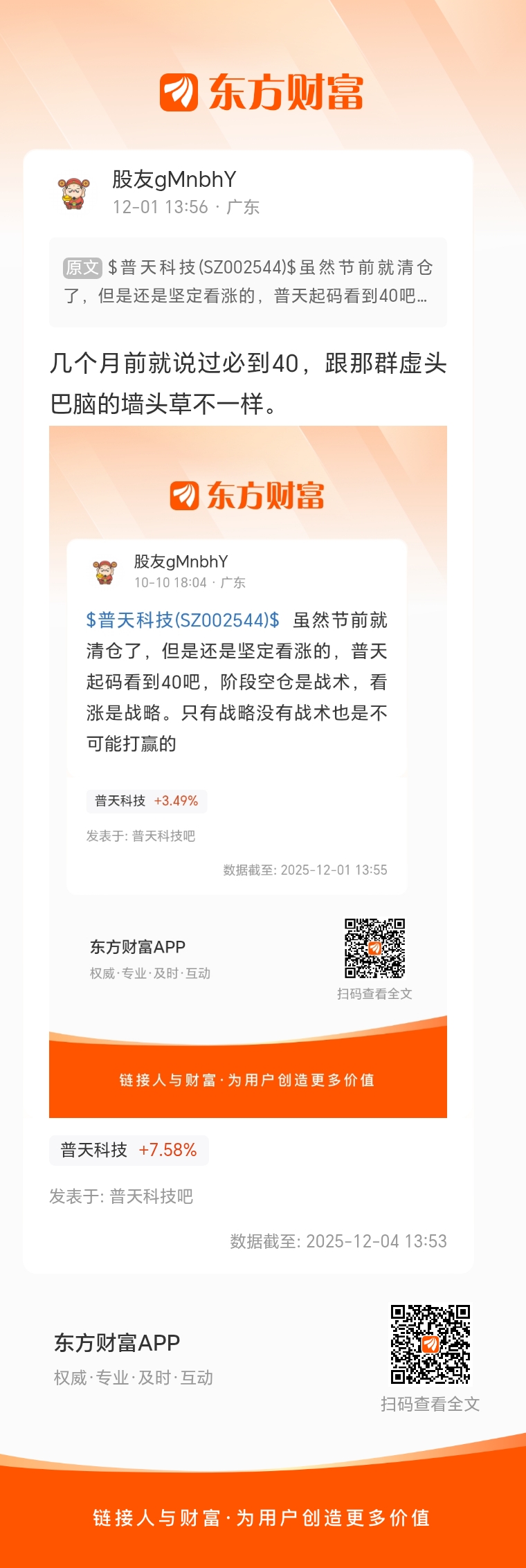 $普天科技(SZ002544)$ 虽然节前就清仓了,但是还是坚定看涨的,普天起码看到40吧,阶段空仓是战术,看涨是战略。只有战略没有战术也是不可能打赢的