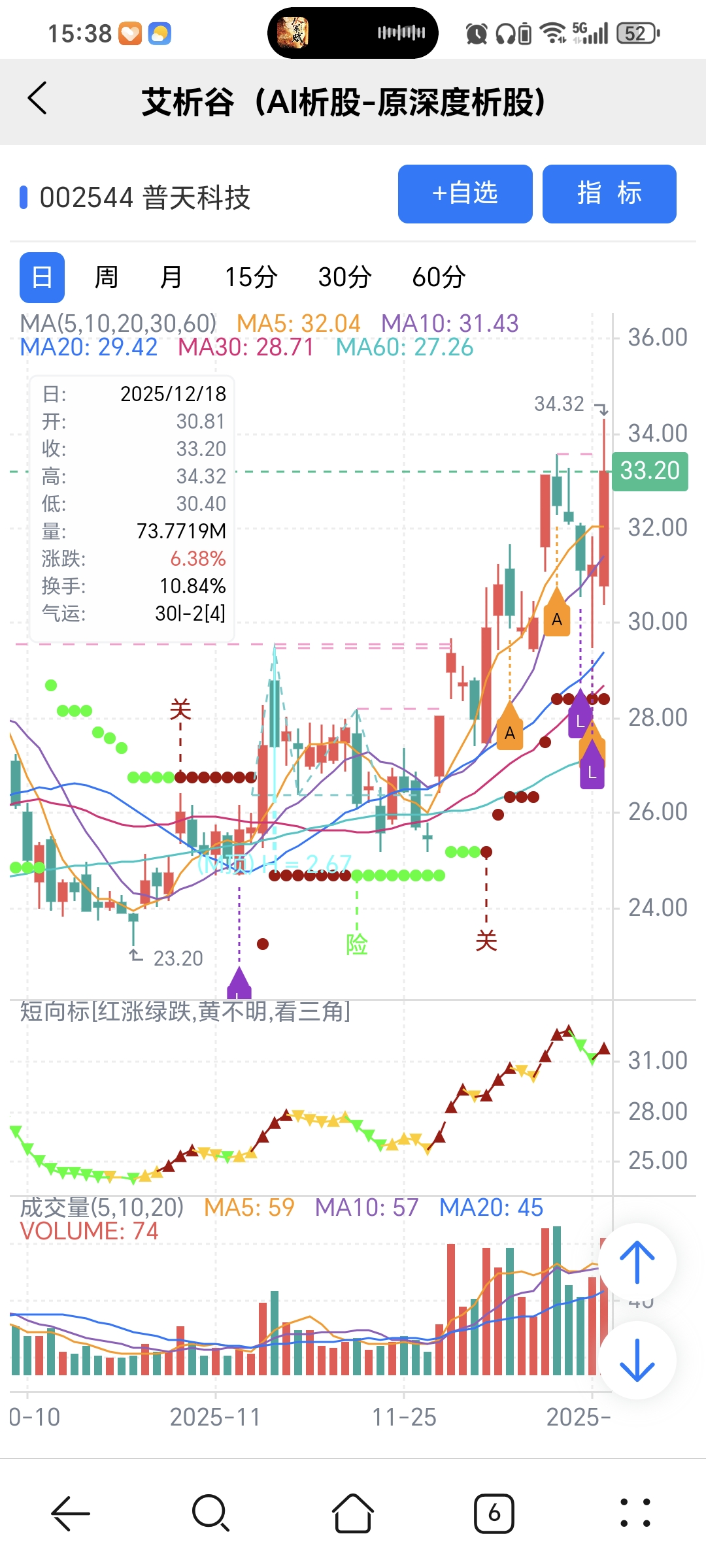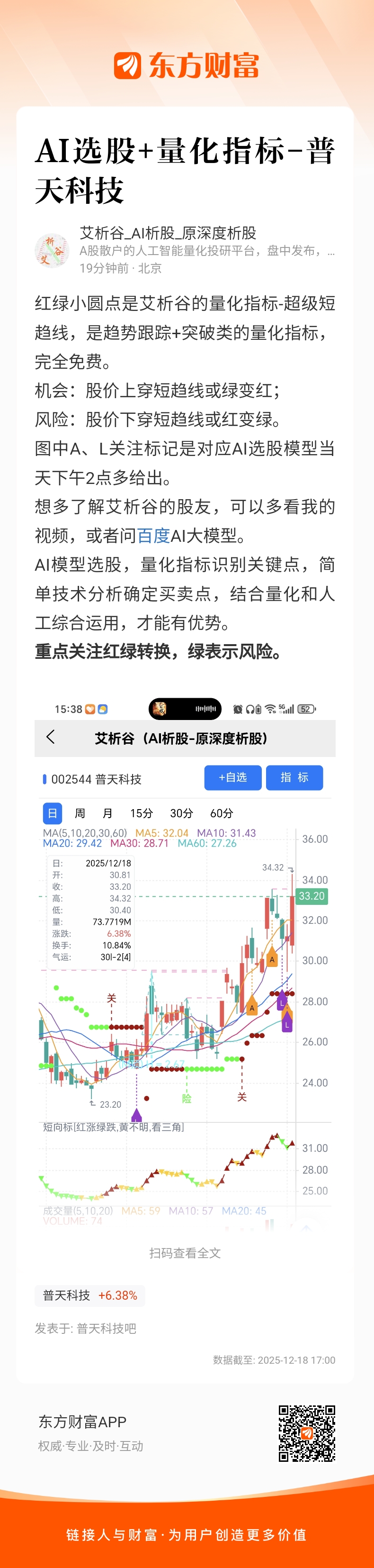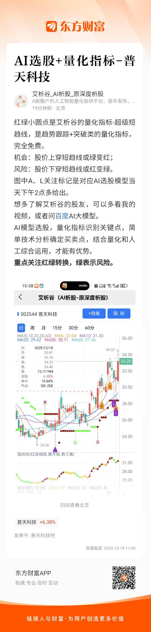 红绿小圆点是艾析谷的量化指标-超级短趋线,是趋势跟踪+突破类的量化指标,完全免费。