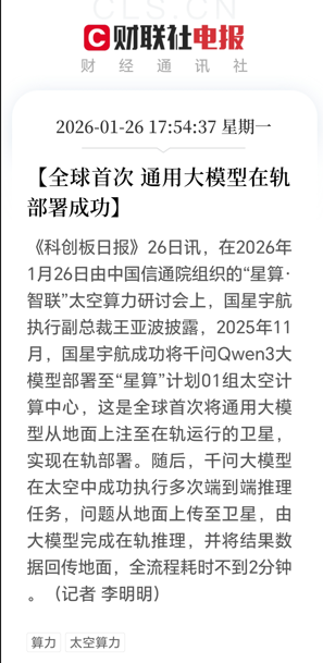 中国信息通信研究院定于 2026 年 1 月 26 日下午2点召开 “星算智联” 太空算力研讨会。会议将举行 “算力星网” 联合推进倡议暨《太空算力发展前瞻研究报告(2026 年)》启动仪式。之江实验室将介绍 “三体计算星座”。普天科技已通过之江实验室第三方权威验证,其激光 - 微波复合传输技术与地面支撑系统成功适配星座在轨运行需求,为 “天数天算” 模式落地提供核心链路支撑。
