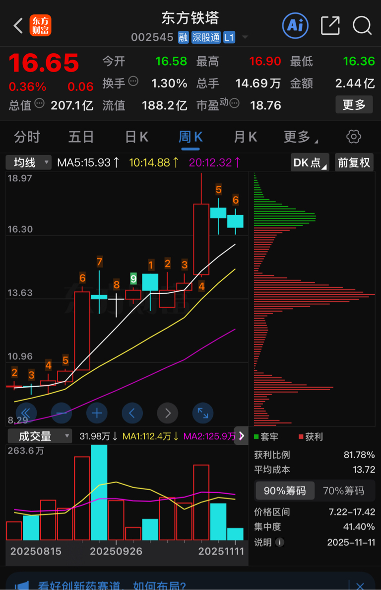 $东方铁塔(SZ002545)$ 东方铁塔的周K,倍量后的调整十分充电了
