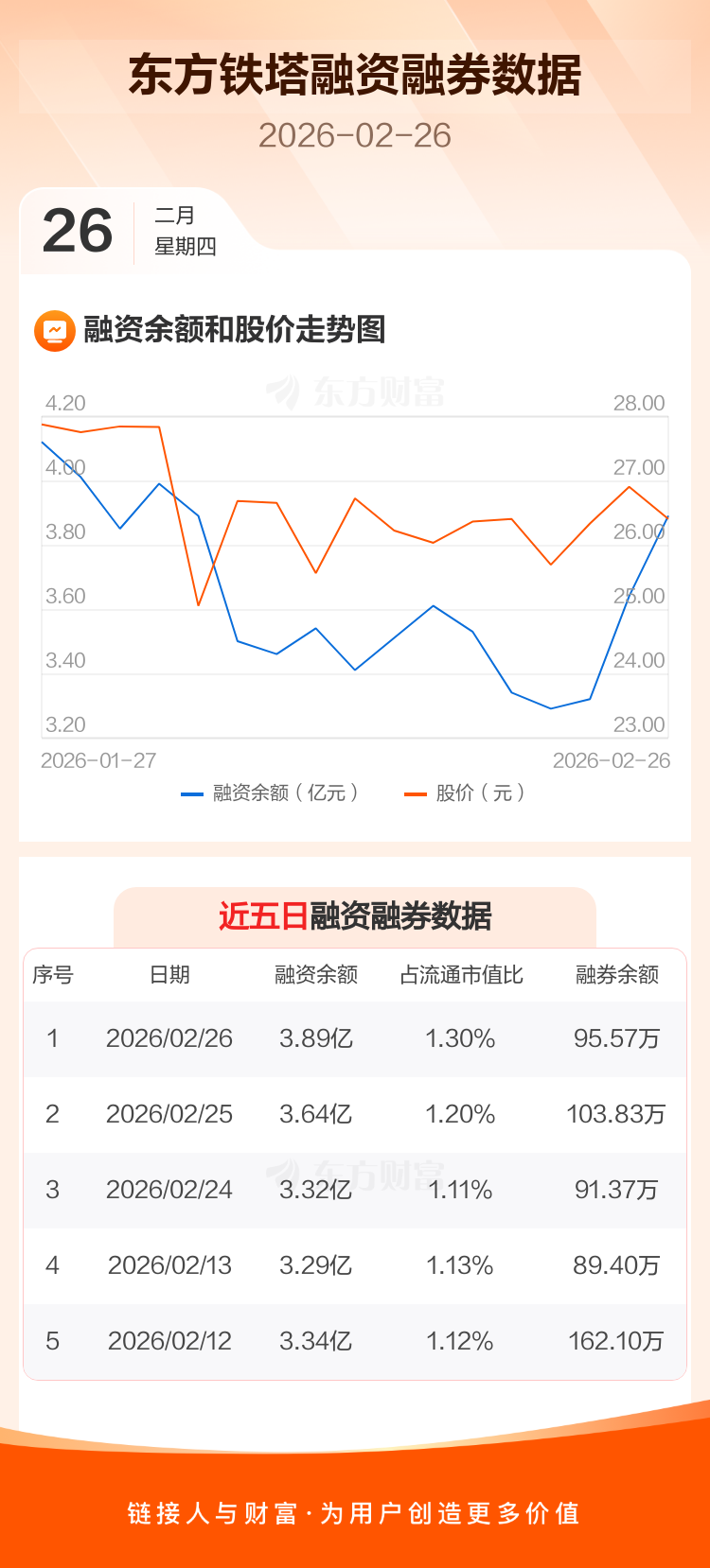 交易所最新数据显示,东方铁塔于2026年2月26日获融资买入5328.51万元,融资偿还2818.84万元,当日融资净买入2509.67万元。目前,该股融资余额3.89亿,占流通市值比例为1.30%。
