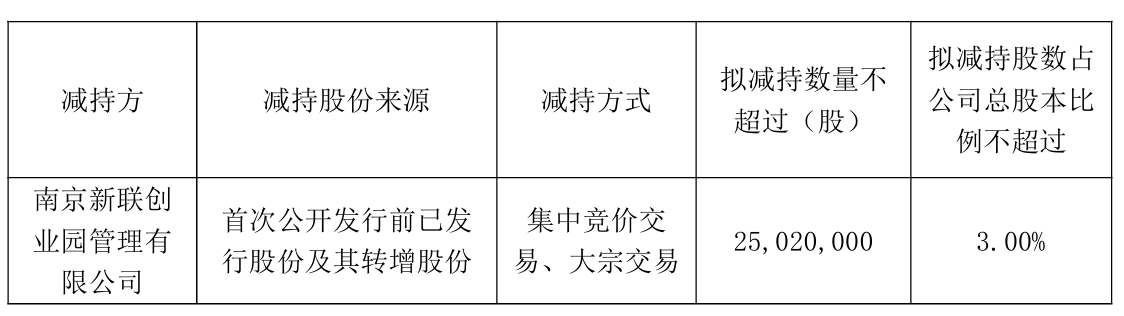 1月7日晚间,新联电子(002546)发布公告称,公司控股股东南京新联创业园管理有限公司(下称“创业园”)计划自本公告披露之日起15个交易日后的3个月内通过集中竞价、大宗交易方式减持不超过2502万股,占公司总股本的3%。