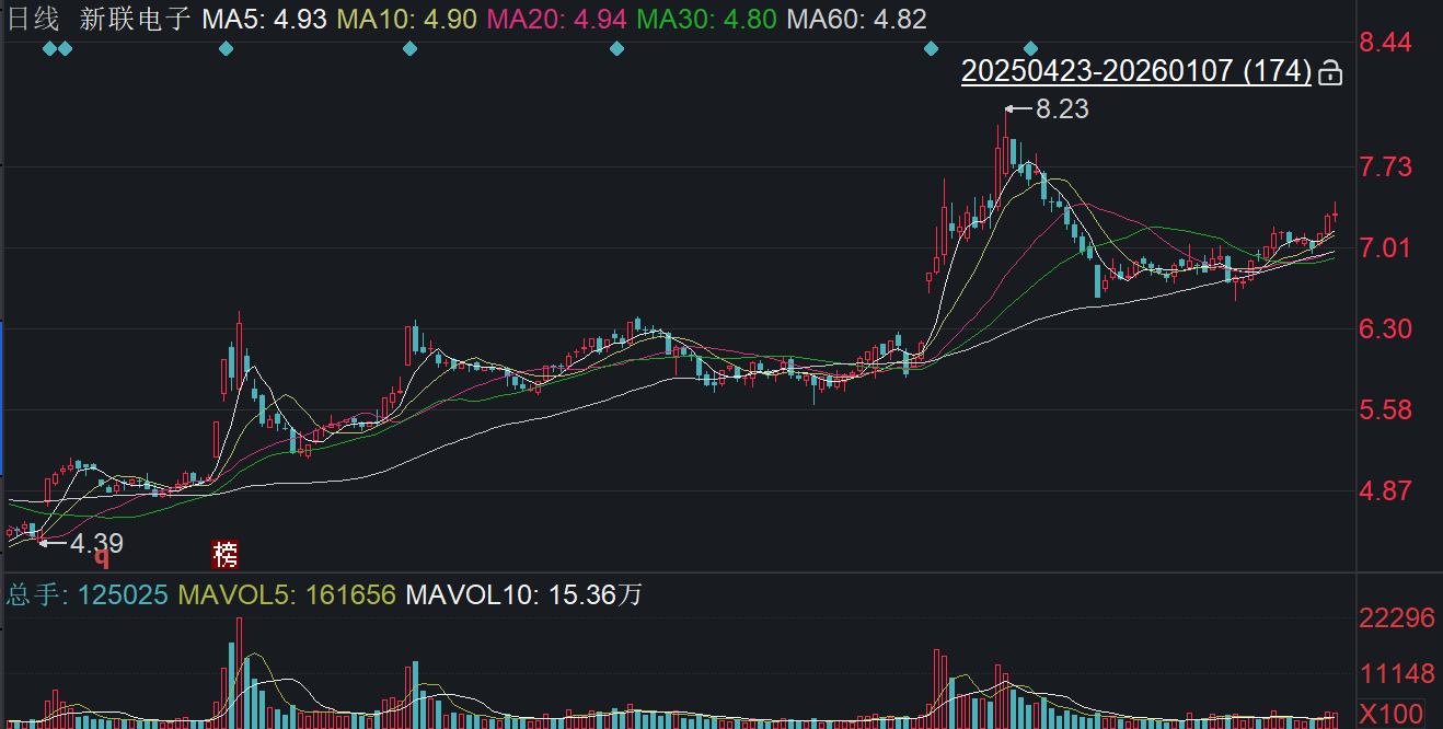 二级市场上,截至1月7日收盘,新联电子上涨0.27%报7.30元/股,总市值约60.89亿元,近一年公司股价累计上涨约77%。