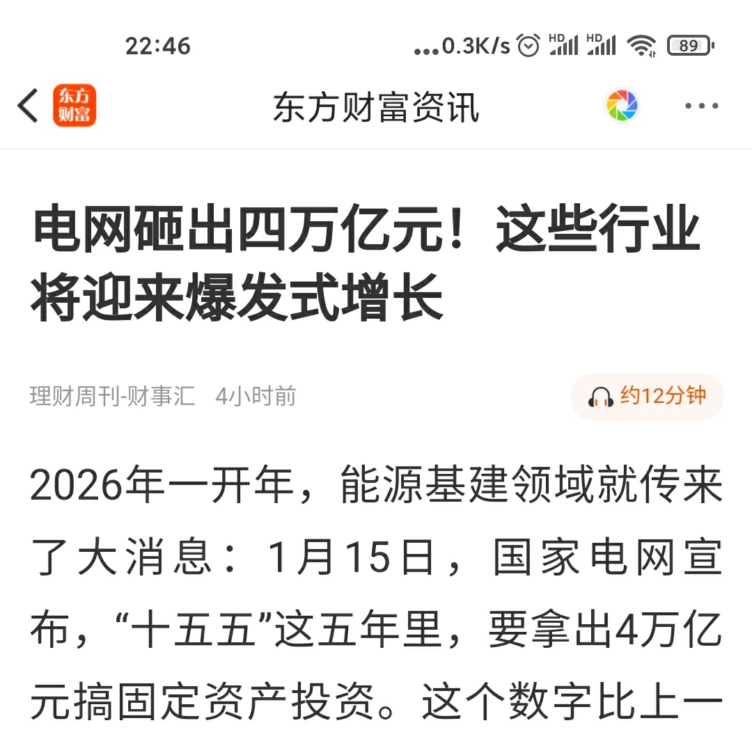 超.重磅消息:1月15日,国家电网宣布,“十五五”这五年里,要拿出4万亿元搞固定