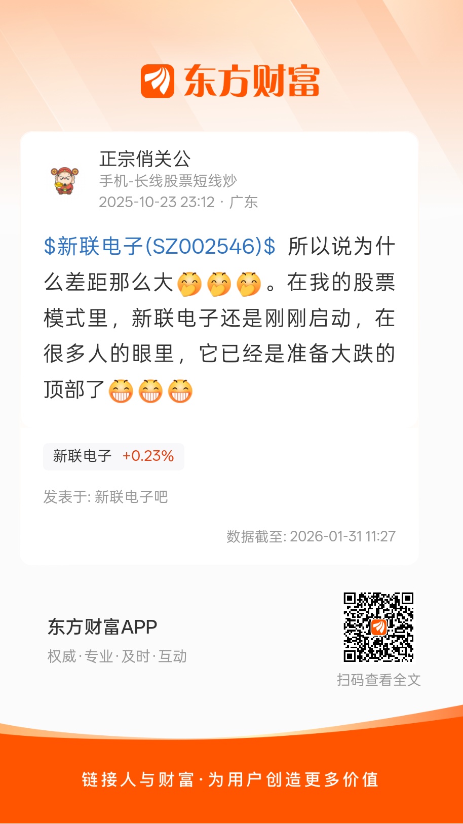 温馨提示: 1.根据《证券法》规定,禁止编造、传播虚假信息或者误导性信息,扰乱证券市场;2.用户在本社区发表的所有资料、言论等仅代表个人观点,与本网站立场无关,不对您构成任何投资建议。用户应基于自己的独立判断,自行决定证券投资并承担相应风险。《东方财富社区管理规定》