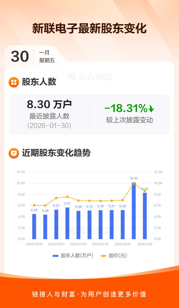新联电子:截至1月30日最新股东户数8.30万户,较上期减少18.31%