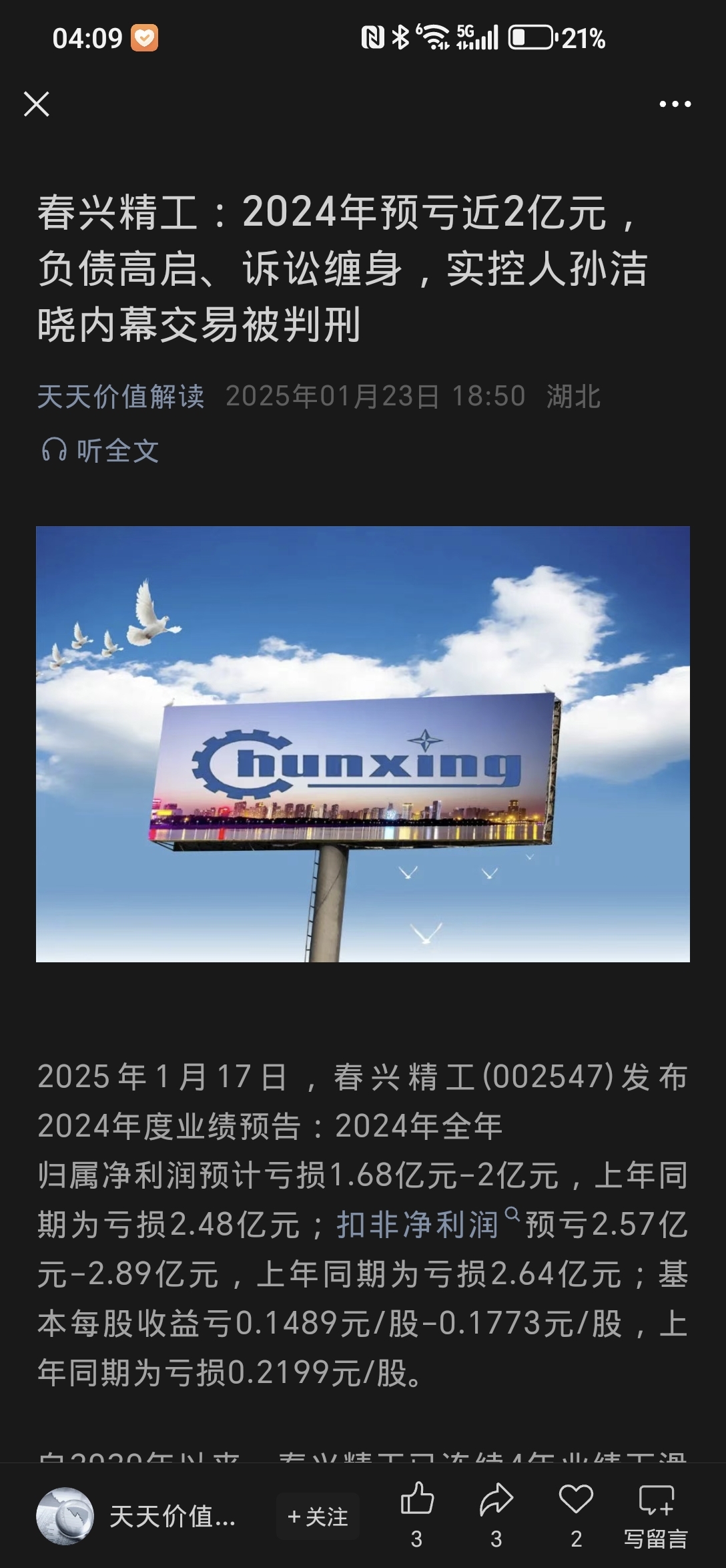 $春兴精工(SZ002547)$ 兄弟们,我咋感觉我越来越了解了呢,哈哈哈,我有一种预感,1.5元的股价都高了,公司连续4年亏损25亿,而且营收越来越低,典型的夫妻老婆店,加上这个业绩持续恶化负债高启、诉讼缠身,太恐怖了,兄弟姐妹们,不是我唱衰,听我的估计都有20个点的止损了,大家找找一些好的公司投资,不要跟自己钱过不去,这种票不是1块钱的价位,我都觉得高了