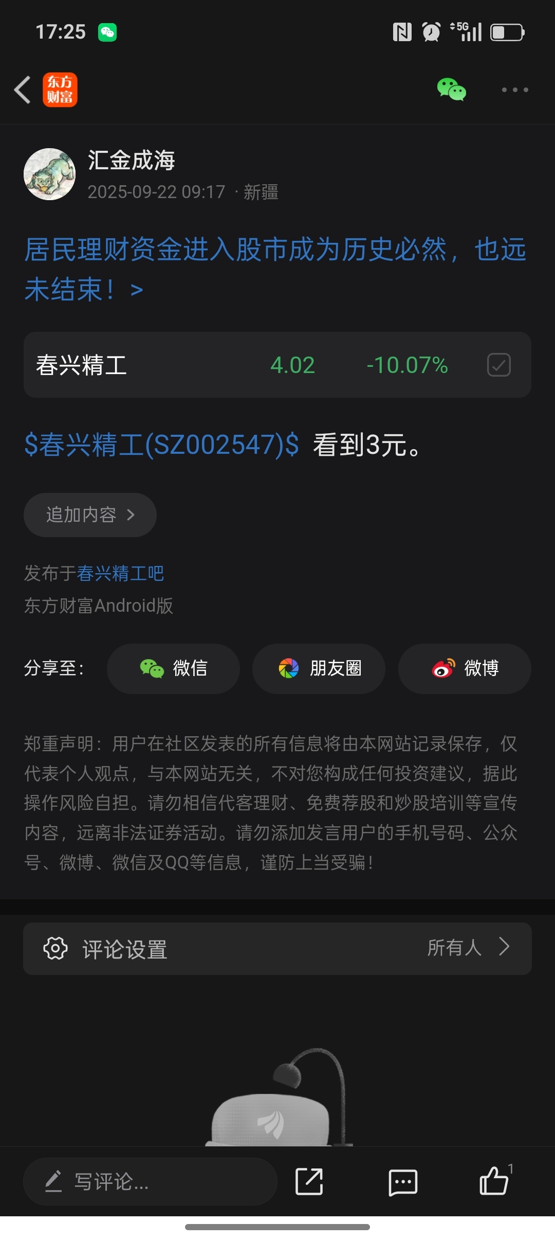 温馨提示: 1.根据《证券法》规定,禁止编造、传播虚假信息或者误导性信息,扰乱证券市场;2.用户在本社区发表的所有资料、言论等仅代表个人观点,与本网站立场无关,不对您构成任何投资建议。用户应基于自己的独立判断,自行决定证券投资并承担相应风险。《东方财富社区管理规定》