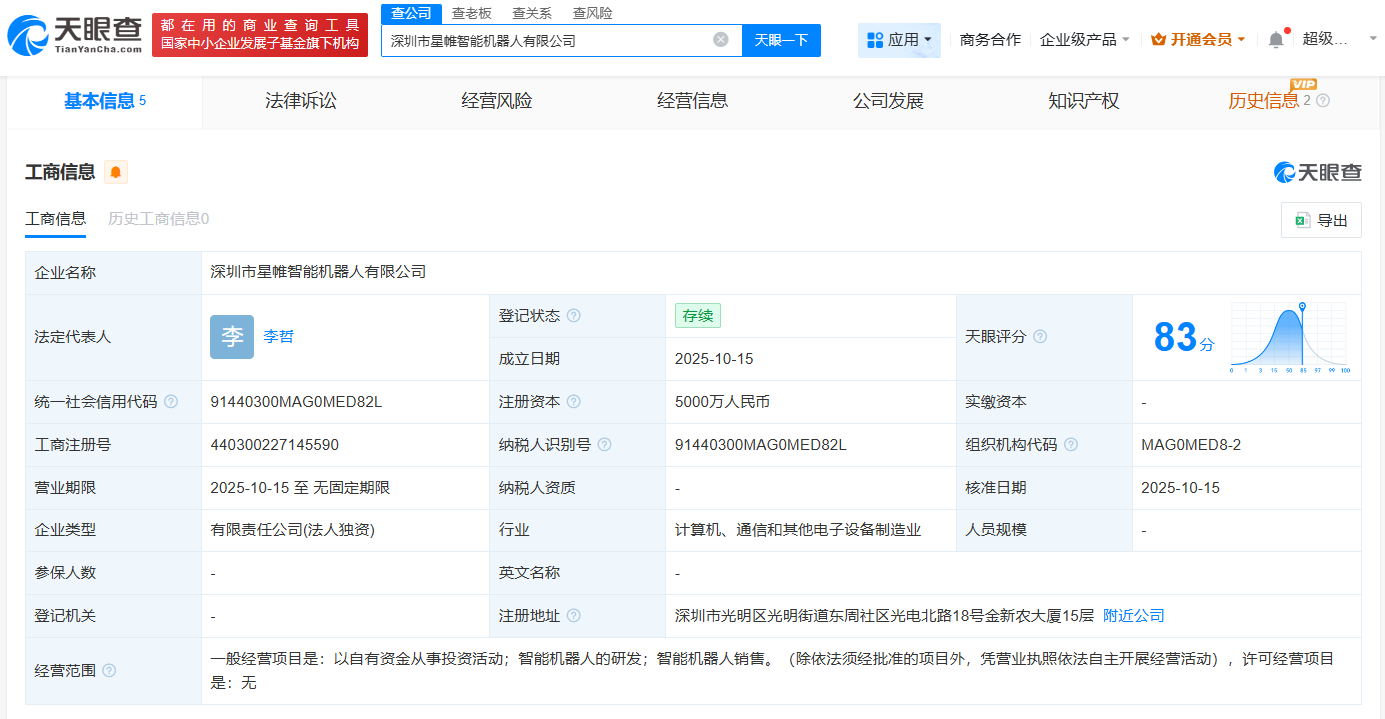 每经AI快讯,天眼查App显示,近日,深圳市星帷智能机器人有限公司成立,法定代表人为李哲,注册资本5000万元人民币,经营范围为以自有资金从事投资活动、智能机器人的研发、智能机器人销售。股东信息显示,该公司由金新农(002548)全资持股。