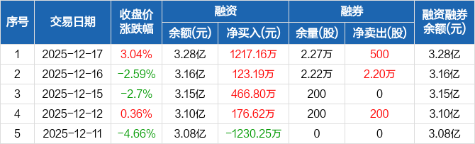 融资方面,当日融资买入2339.33万元,融资偿还1122.17万元,融资净买入1217.16万元,连续4日净买入累计1983.77万元。融券方面,融券卖出1300股,融券偿还800股,融券余量2.27万股,融券余额12.3万元。融资融券余额合计3.28亿元。