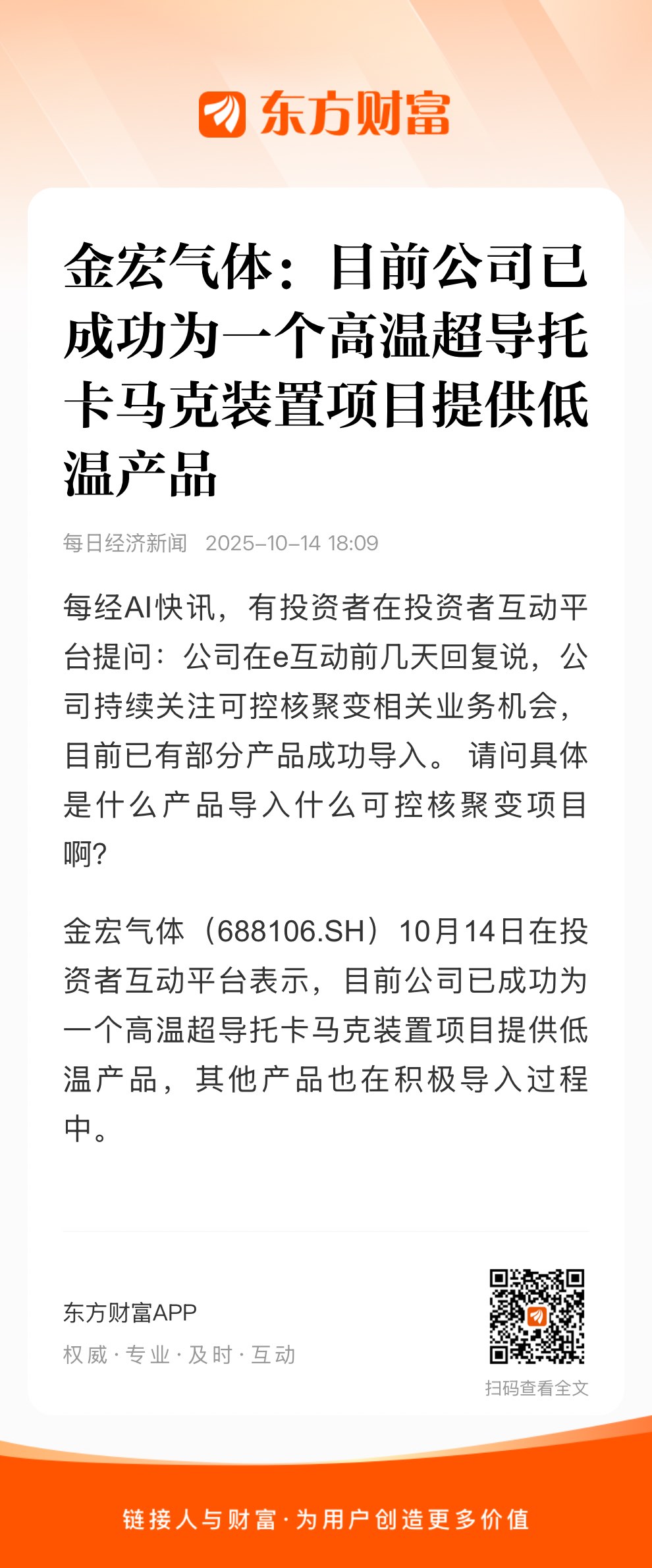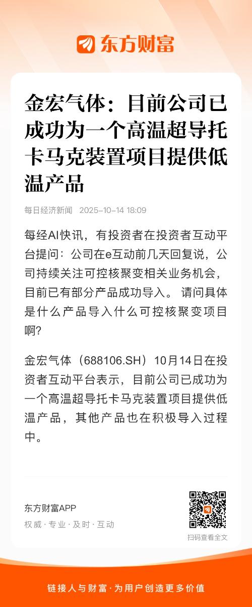 $凯美特气(SZ002549)$ $金宏气体(SH688106)$ 托卡马克是当前最接近聚变实际应用条件、全球各国投入力度最大、技术发展最为成熟的核聚变主流研究路径。金宏气体作为一家专业从事气体研发、生产、销售与服务的综合气体供应商,其产品覆盖特种气体、大宗气体等多个品类,已成功为高温超导托卡马克装置项目提供低温产品,推测可能为液氦或高纯二氧化碳等关键低温气体。其中,高纯二氧化碳可直接用于低温制冷环节;液氦作为托卡马克装置低温系统的常用冷却介质,金宏气体也已通过与中集安瑞科围绕“液氦储运一站式解决方案”展开战略合作,计划批量采购液氦罐箱,以完善液氦在存储、运输及分配全链条的保障能力。此外,其产品中的液氮,同样可作为深度冷冻剂应用于相关低温场景。