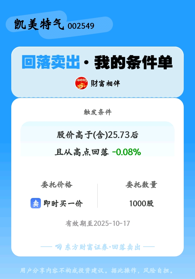#条件单交流# #回落卖出晒单# 一位股神设置了一个回落卖出条件单,接下来就是见证奇迹的时刻~$凯美特气(SZ002549)$
