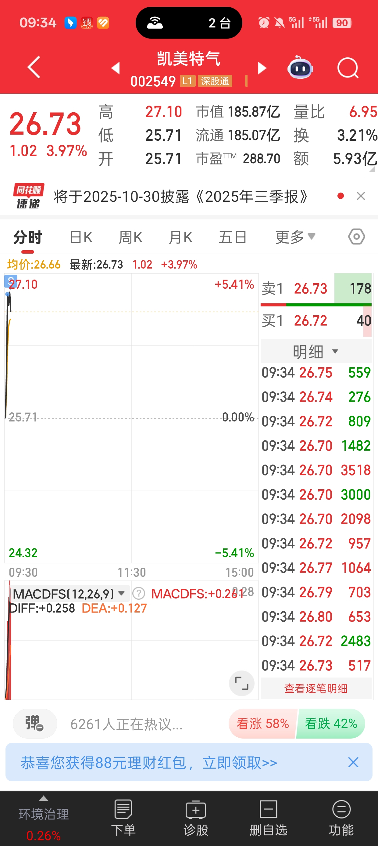 $凯美特气(SZ002549)$ 昨天尾盘进,预判了你今天的节奏,博你一个拉高