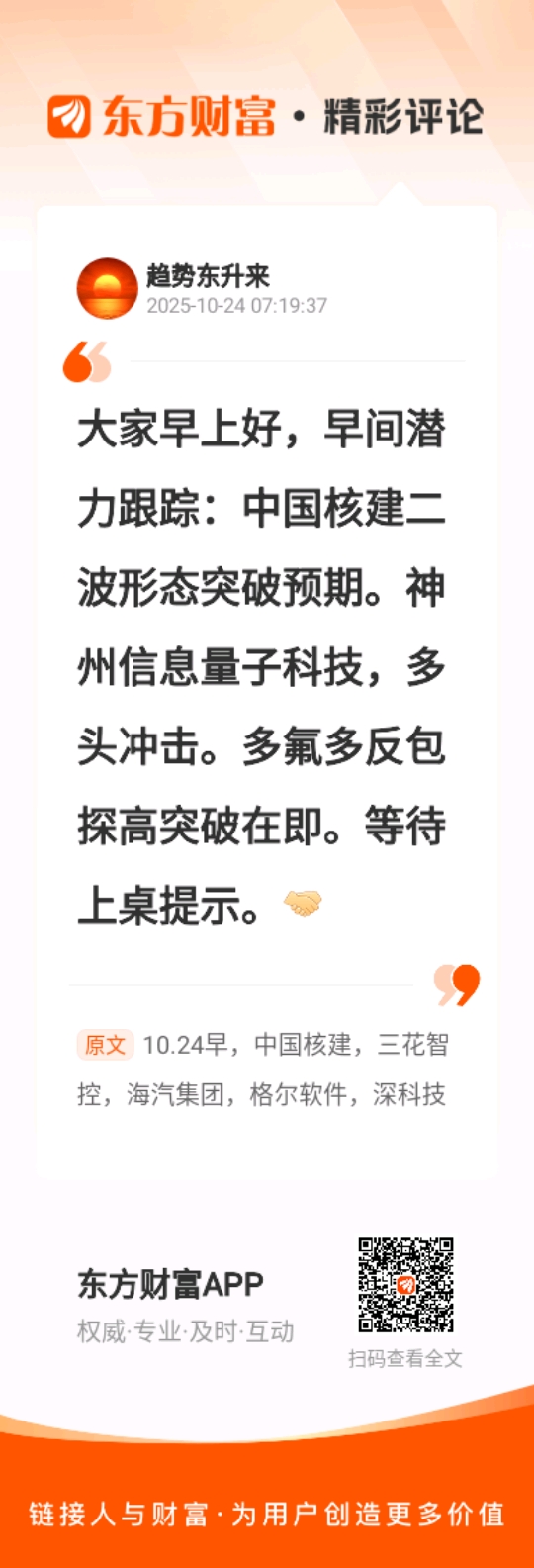 $凯美特气(SZ002549)$$三花智控(SZ002050)$$山子高科(SZ000981)$//@趋势东升来 :大家早上好,早间潜力跟踪:中国核建二波形态突破预期。神州信息量子科技,多头冲击。多氟多反包探高突破在即。等待上桌提示。