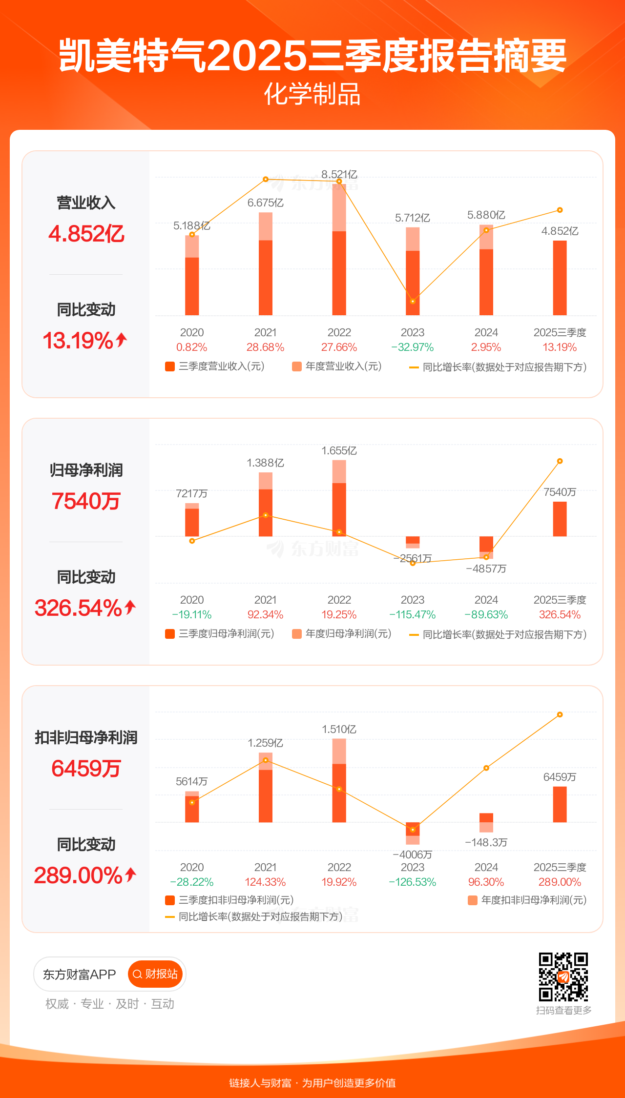 凯美特气10月30日发布2025年三季报显示,公司前三季实现营业收入4.85亿元,同比增长13.19%;归母净利润7539.81万元,同比增长326.54%;扣非归母净利润6458.93万元,同比增长289.00%。