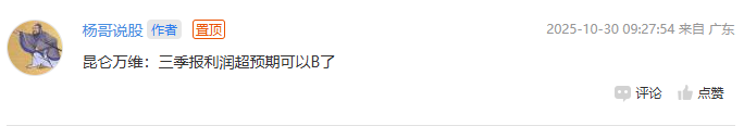 $昆仑万维(SZ300418)$:今日随AI板块情绪冲高后回落,整体呈现震荡调整走势,但短期市场对AI概念的情绪波动较大,导致股价走势缺乏稳定性,不过AI领域布局任有想象空间,公司三季度利润超预期,今天早盘我们也选择了介入,持仓看多。