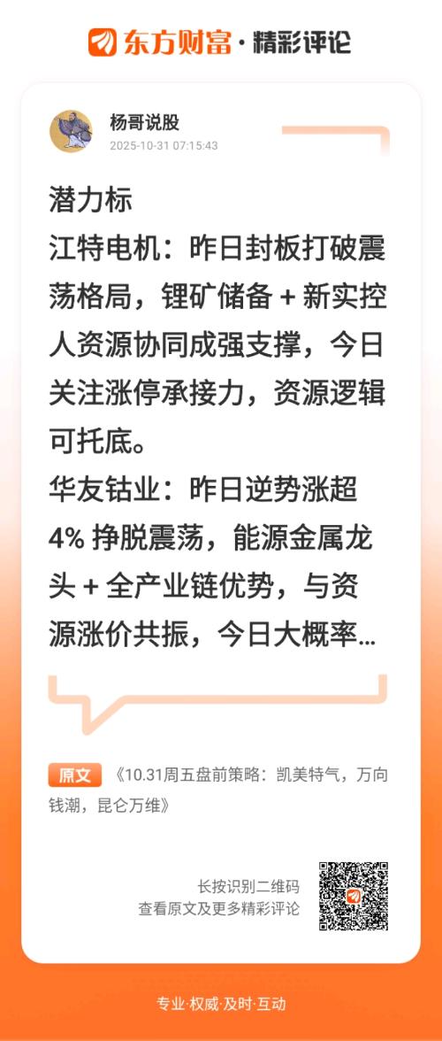 //@杨哥说股 :潜力标江特电机:昨日封板打破震荡格局,锂矿储备 + 新实控人资源协同成强支撑,今日关注涨停承接力,资源逻辑可托底。华友钴业:昨日逆势涨超 4% 挣脱震荡,能源金属龙头 + 全产业链优势,与资源涨价共振,今日大概率续涨。格林美:昨日震荡中涨近 2%,动力电池回收龙头 8.25 元支撑稳固,今日若新能源情绪延续,有望破 8.63 元压力位。指数与盘面指数:昨日调整为正常节奏切换,资金向低位优质板块转移,上行格局未改;今日早盘或在关键点位修复,流动性宽松支撑下,短期震荡后望续涨。盘面:昨日分化属健康节奏,量子科技热度持续、能源金属联动显著成核心主线;轮动下低位赛道有修复条件,周五情绪或克制但趋势向好。持仓复盘赛力斯:昨日冲高回落,筹码分散致走势不连贯,当前处震荡区间上沿;今日关注能否站稳 165 元,突破则开上行空间,震荡则需时间整理,持仓观望。$凯美特气(SZ002549)$:昨日大盘跳水时早盘下探后回升收红,半导体材料赛道韧性足;今日看能否借题材热度冲区间上沿,警惕热度退潮破支撑,持仓观察。$万向钱潮(SZ000559)$:昨日震荡回落显弱势,分歧增近支撑位;今日紧盯支撑位防守,放量破位且难收复则控仓,企稳放量则等反弹,锁仓观察。$昆仑万维(SZ300418)$:昨日随 AI 板块冲高回落,短期情绪波动致走势不稳,但中长期逻辑 + 三季度利润超预期仍在;今日看能否收复昨日跌破位,走弱则短期整理,持仓格局。