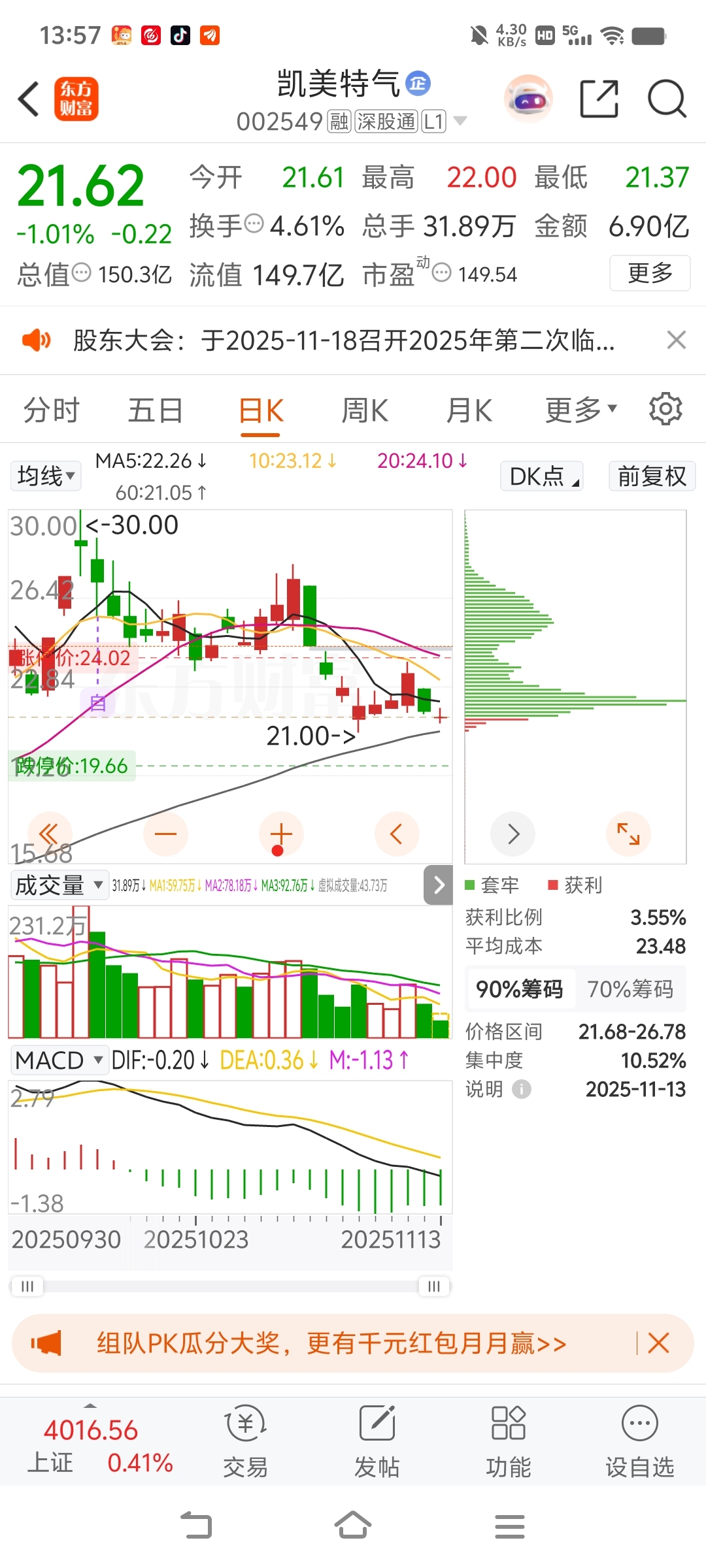 $凯美特气(SZ002549)$ 兄弟们,看看上方套牢盘,还有希望吗?