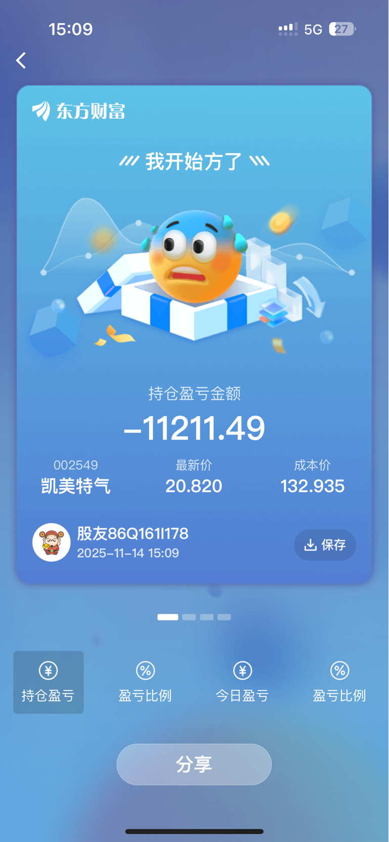 $凯美特气(SZ002549)$ 22块多的本我都没法抗了。走了,留下100股观望。下周反弹再接回,周一估计也是低开,熬不住了。