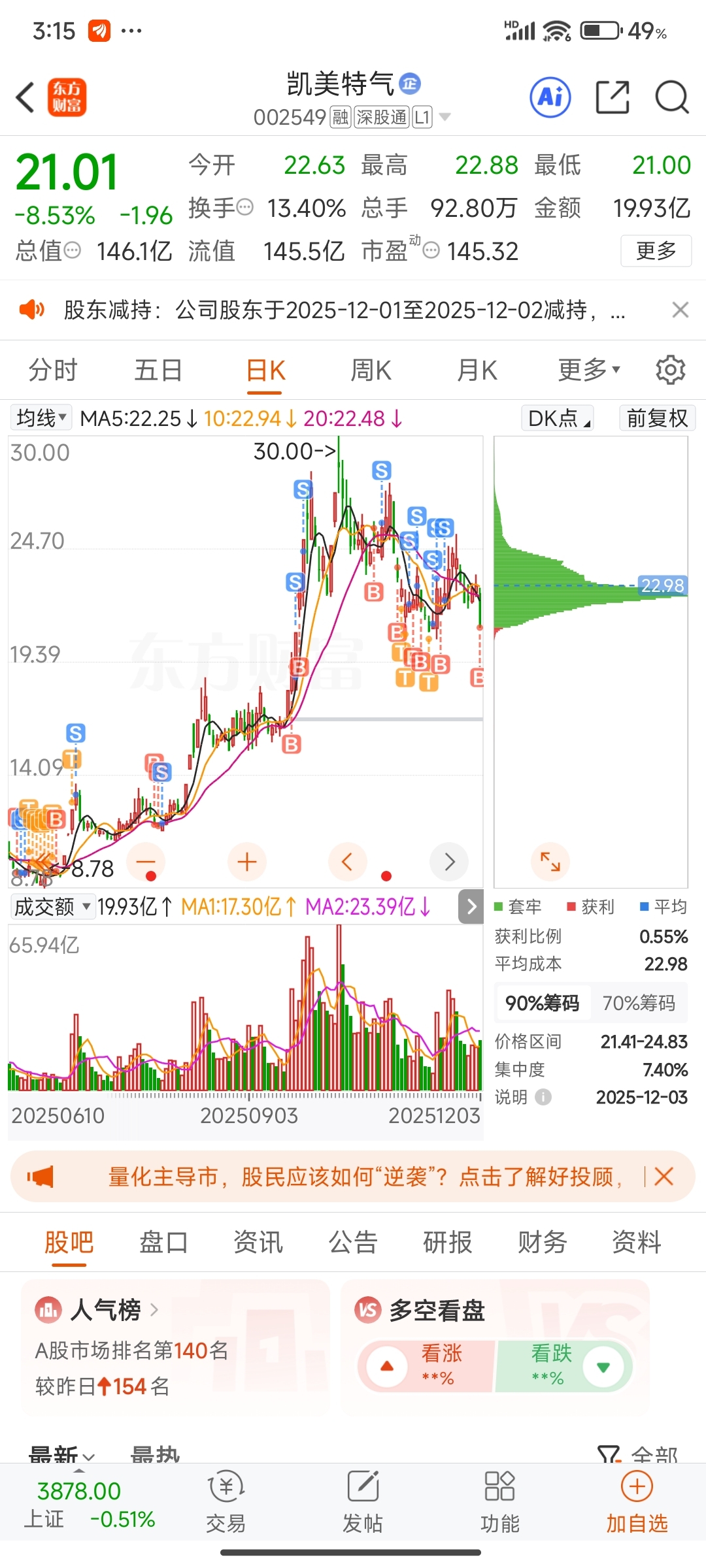 家人们不要怕我是一路看着凯美涨上来的,一般我入场了就说明要反转了,没卖的明天都别