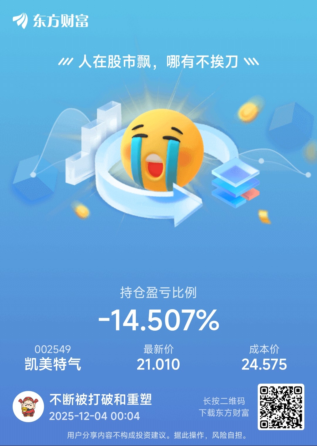 $凯美特气(SZ002549)$ 股市之路慢慢 荤素搭配 吃肉时心比天高 吃面时却责怪自己的选择 这一切的一切都是自己的咎由自取 已经被深套 才持1200股 这遥遥无期的回本之路 又不舍得割肉 这行情想做T都做不了 诶甚是迷茫…