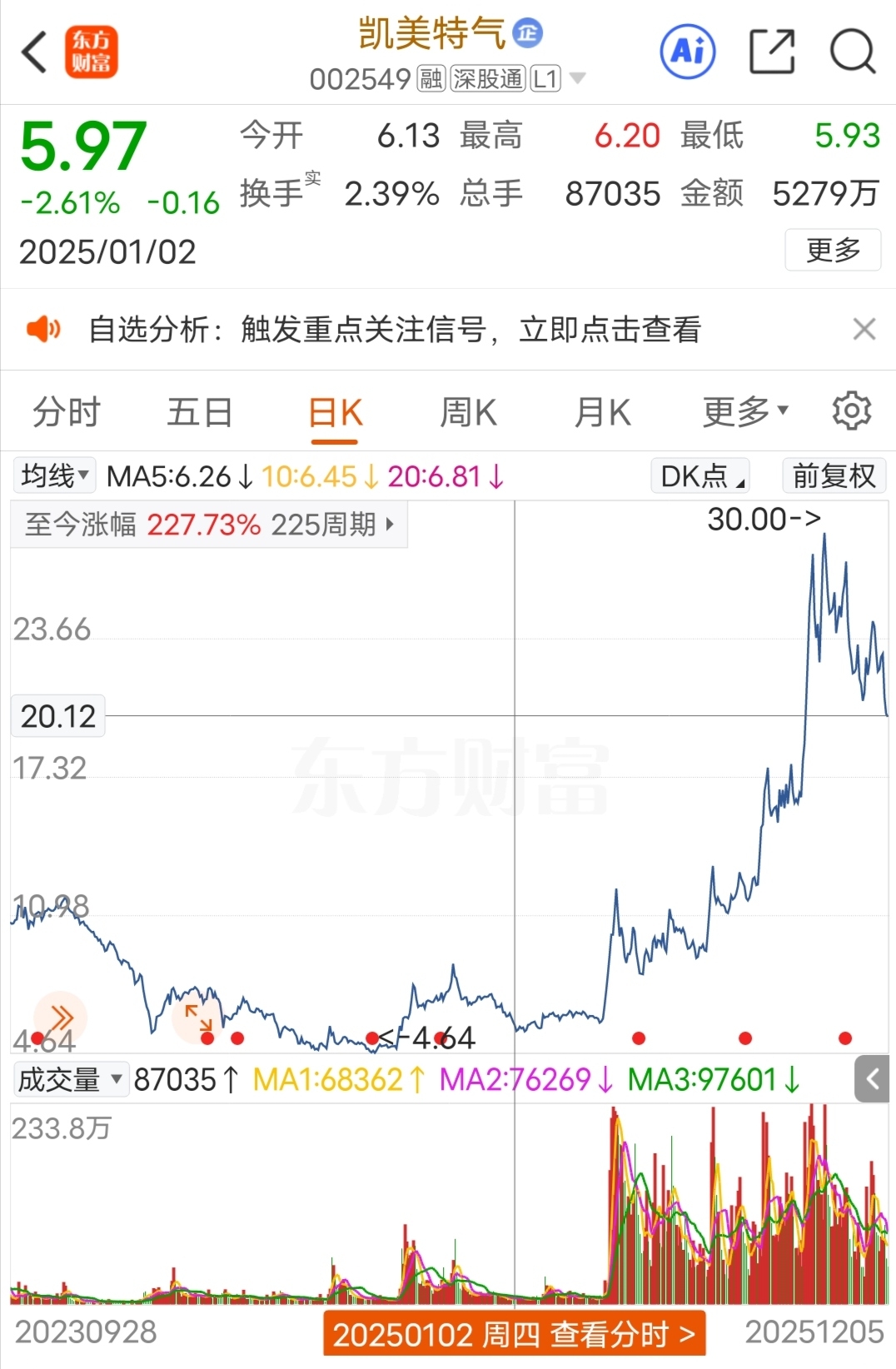 $凯美特气(SZ002549)$ 时间线拉长来看,今年最高涨了五倍,市盈率138倍,看这图有点可怕。。。
