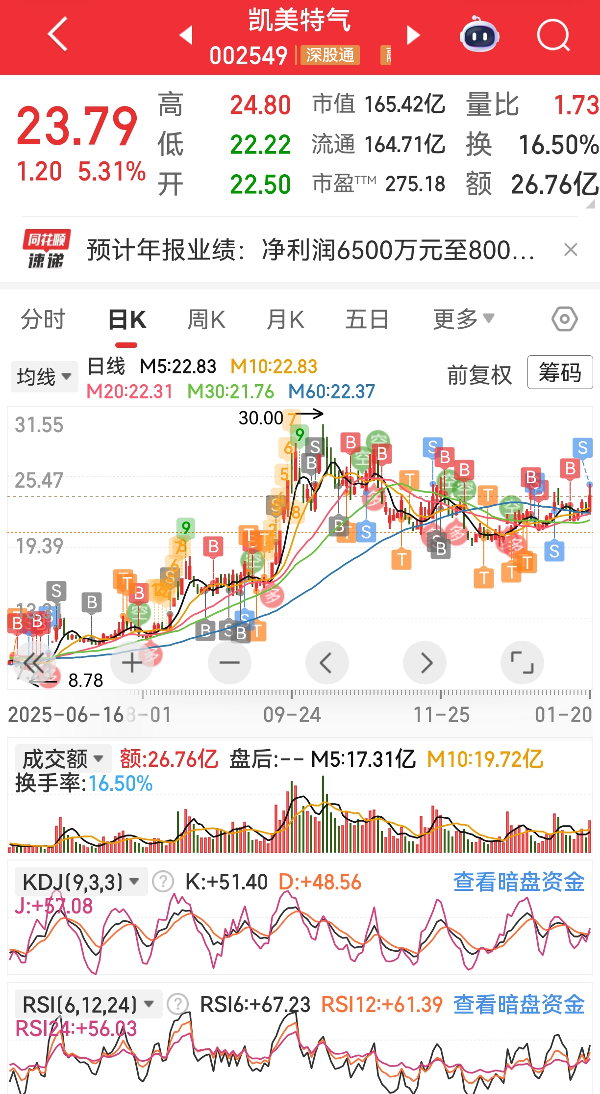 $凯美特气(SZ002549)$ 凯美特气大家拿稳就好,是国产卡脖子替代热点股,我去年从9元做到28元(如图),每次做波段,凯美去年是我的赚钱主力,基本一直拿着,看kdj,rsi接近历史高点,或者前高压力位就出,跌下来企稳就进,只要不追高,摸清规律,波段操作,稳赚钱,今天没封板减仓了一点,明跌了就分批加,高了就抛,底仓不动,我的目标是继续拿到最高点30元!大家加油!一起发财!