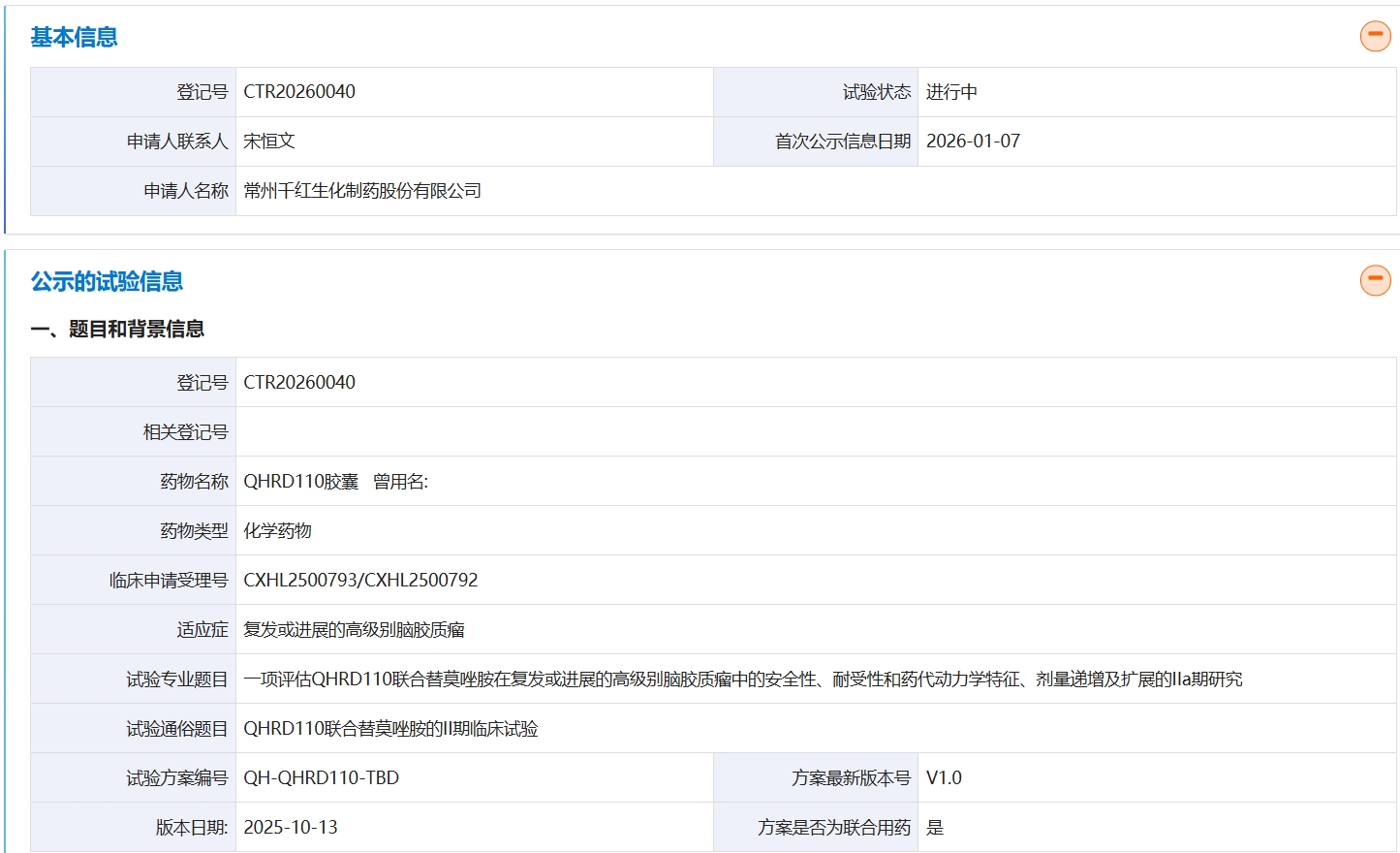 $千红制药(SZ002550)$ 千红最新医药进展:QHRD110联合替莫唑胺的II期临床试验