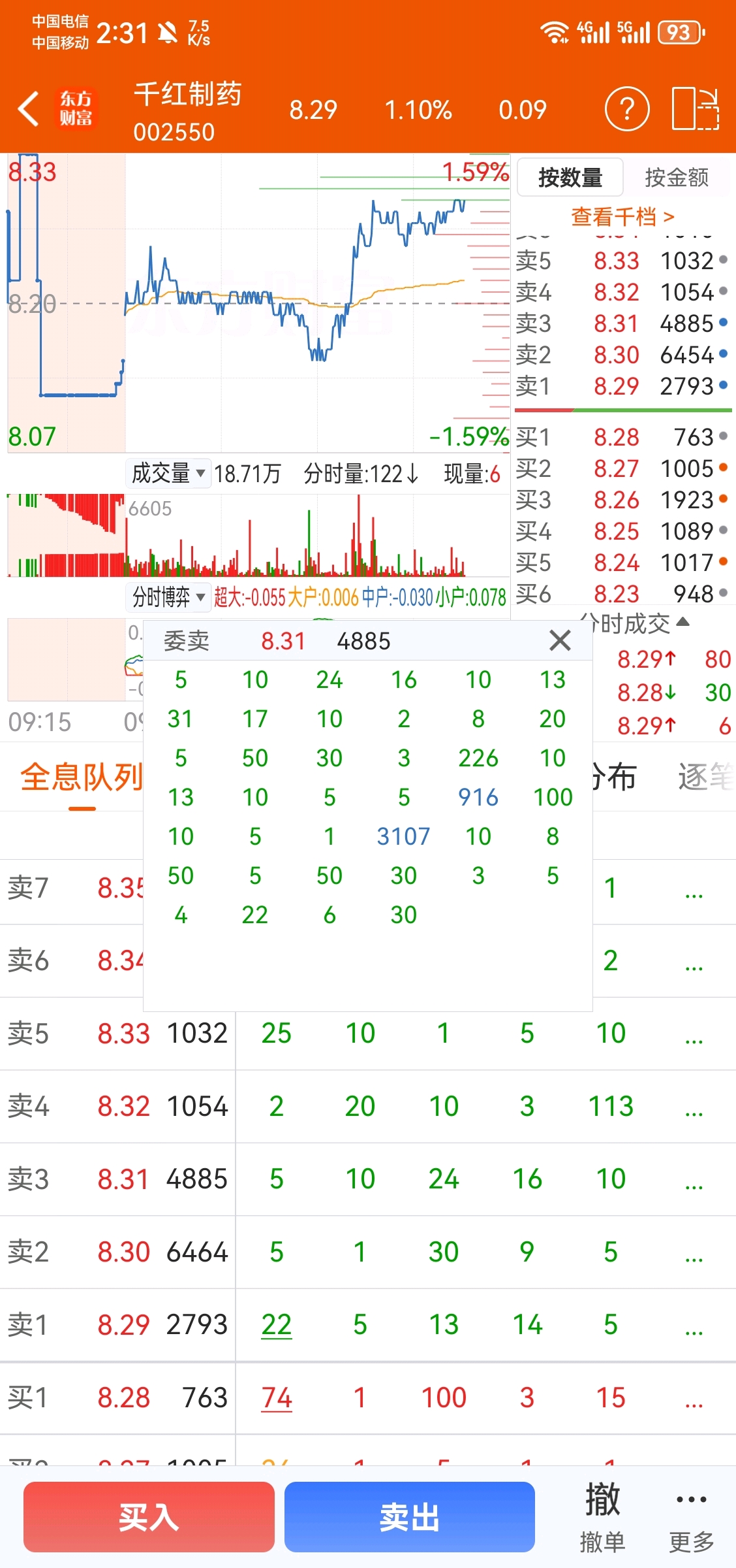 8.31价位,又是有3107手的压单,看着就很烦,大家一起挣钱不好嘛,偏要压着。 //@慧眼如炬炯炯 :一直有6200多的压单在,今天分成了两笔一笔7.983107压着,另一笔7.993106压着,就是压着不让动呗//@慧眼如炬炯炯 :6266又出来了