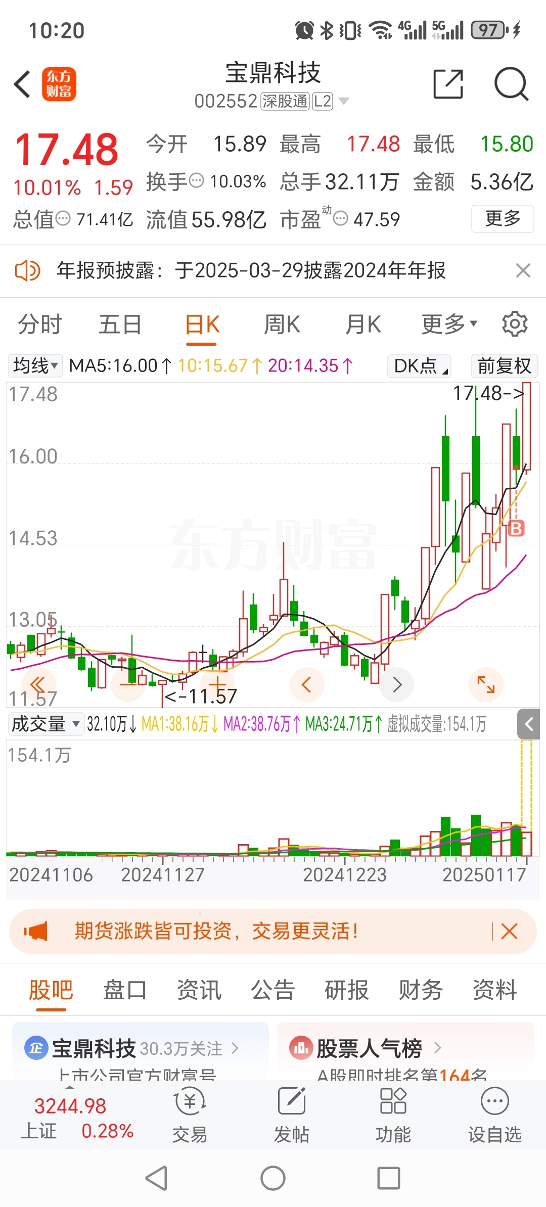 $宝鼎科技(SZ002552)$ 哈哈哈昨天我说什么来着,空狗急眼了,爽,你以为主力陪你玩?上下涨停板就是洗盘,第三次不会下跌了,如果下跌就没了,开始加速了,年底红包,下周继续连板,今天突破箱体,爽啊