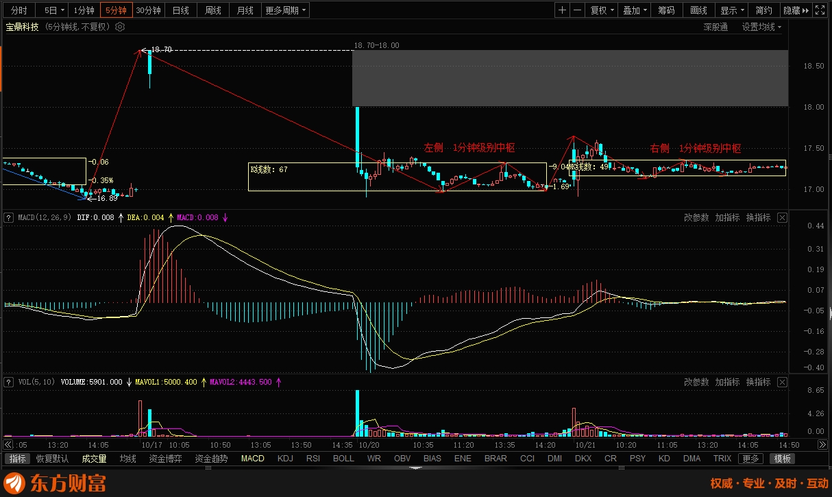 早盘5分钟反弹一笔过前高,回调一笔不破前低,当前位置1分钟级别中枢震荡延伸。