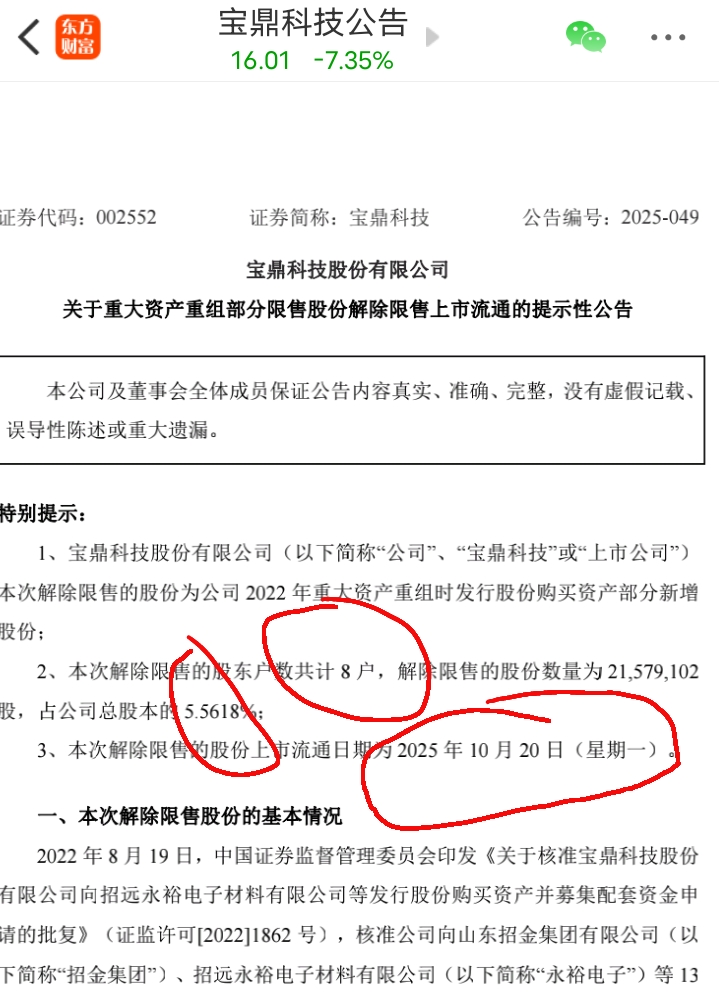 $宝鼎科技(SZ002552)$ 上次解禁8户,20前流通,这次又来不过就一户,超过6%需要减持公告