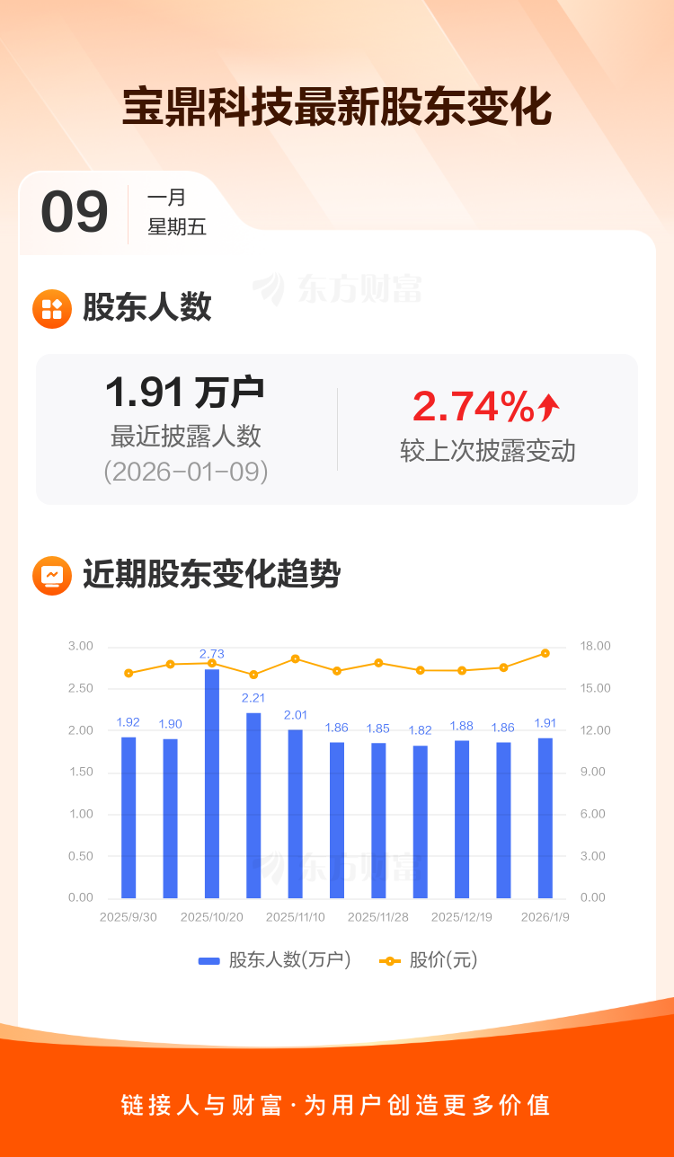 宝鼎科技:截至1月9日最新股东户数1.91万户,较上期增加2.74%