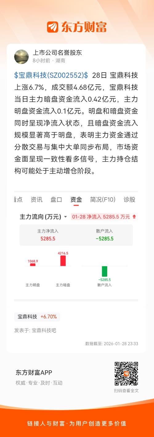 $宝鼎科技(SZ002552)$ 28日 宝鼎科技上涨6.7%,成交额4.68亿元,宝鼎科技当日主力暗盘资金流入0.42亿元,主力明盘资金流入0.1亿元。明盘和暗盘资金同时呈现净流入状态,且暗盘资金流入规模显著高于明盘,表明主力资金通过分散交易与集中大单同步布局,市场资金面呈现一致性看多信号,主力持仓结构可能处于主动增仓阶段。