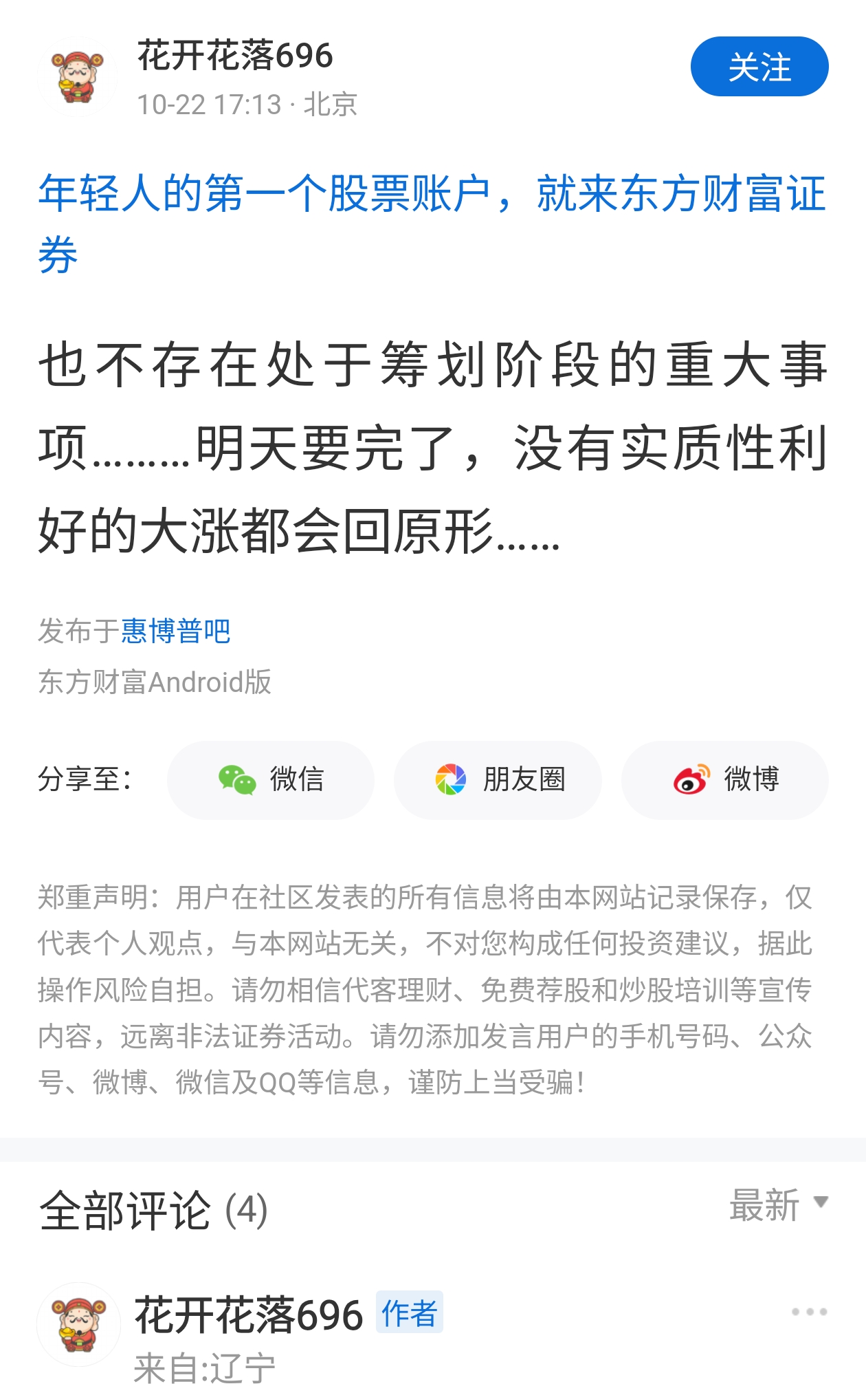 温馨提示: 1.根据《证券法》规定,禁止编造、传播虚假信息或者误导性信息,扰乱证券市场;2.用户在本社区发表的所有资料、言论等仅代表个人观点,与本网站立场无关,不对您构成任何投资建议。用户应基于自己的独立判断,自行决定证券投资并承担相应风险。《东方财富社区管理规定》