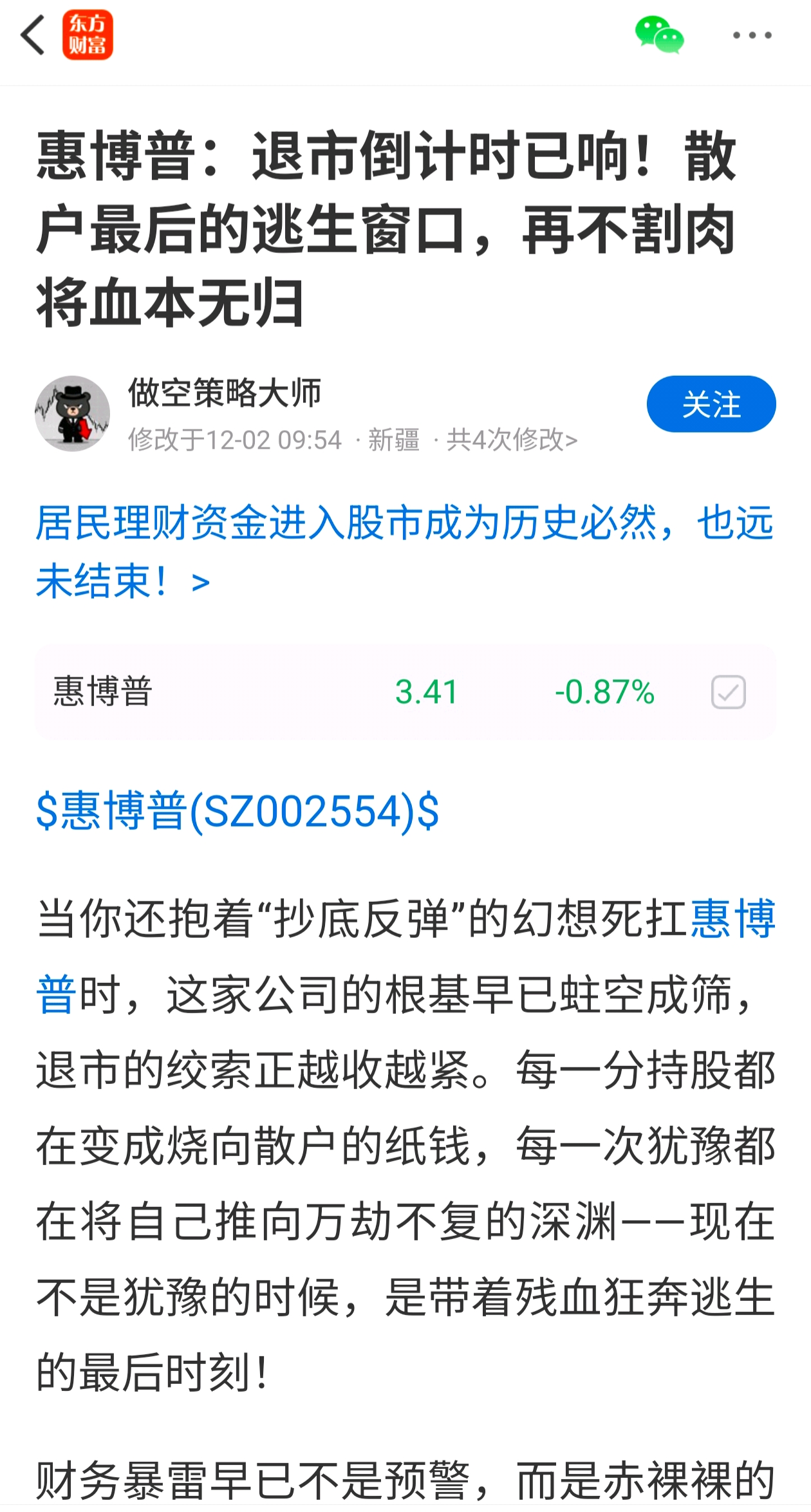 $惠博普(SZ002554)$ 回应做空策略网友,你说我荐股?拿出对应的证据来啊!!!话说带动抛售的应该看看你自己的帖子吧!!!!没有证据说该股退市?还好我昨天就截图了!!事实证据胜于任何辩解