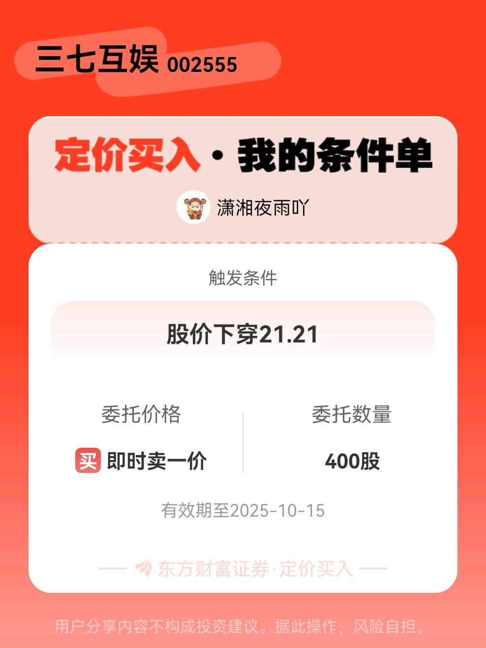 #条件单交流# #定价买入晒单# 一位股神设置了一个定价买入条件单,接下来就是见证奇迹的时刻~$三七互娱(SZ002555)$