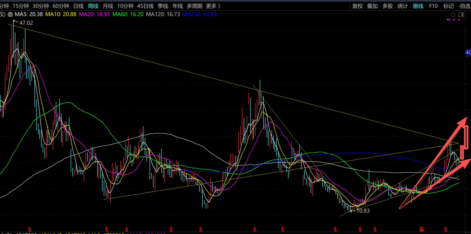 周线,基本这里就是低位,支撑位,后市拉起来就是老鸭张嘴。