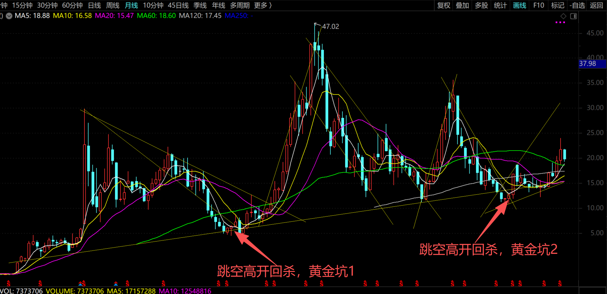 时间拉长,月线,和上一轮暴涨类似,两次都是出现黄金坑周线,基本这里就是低位,支撑