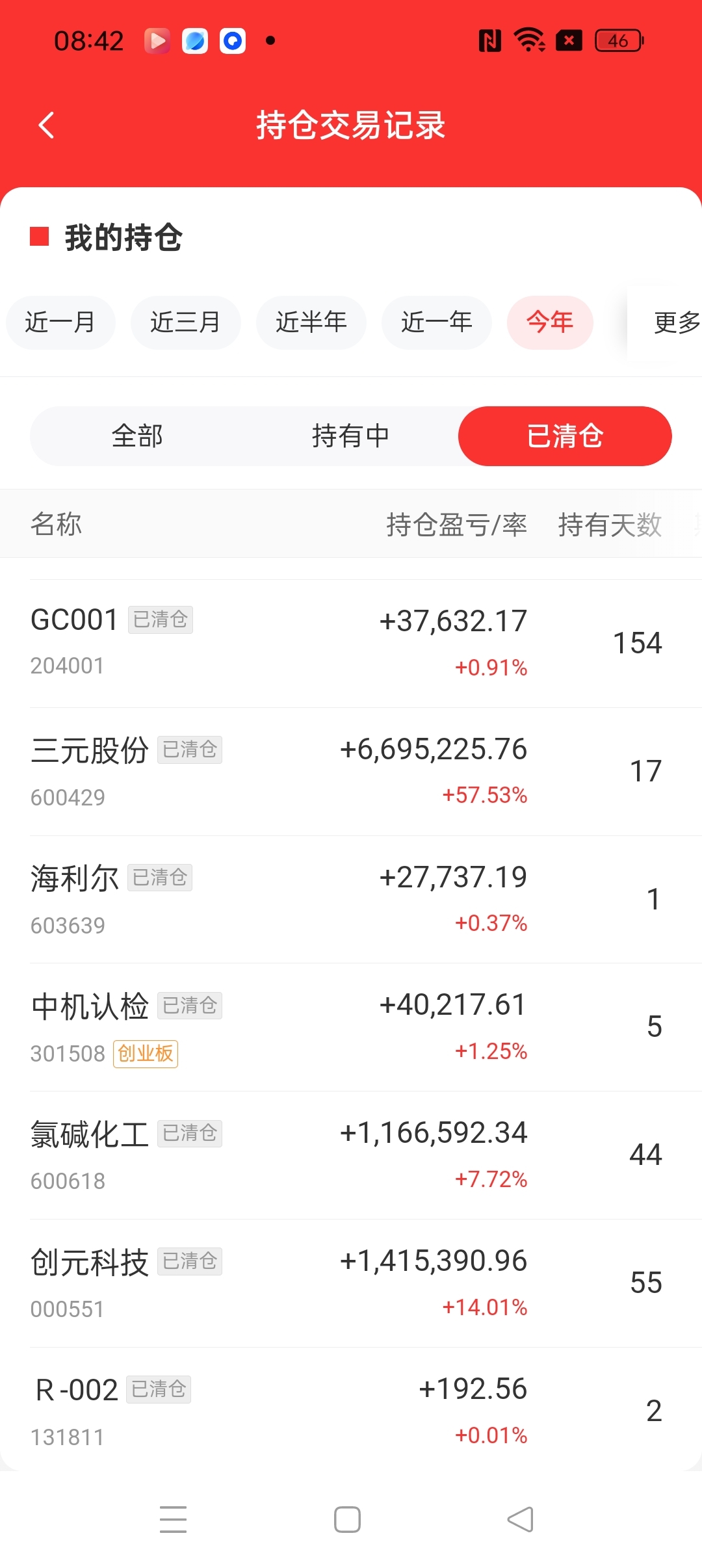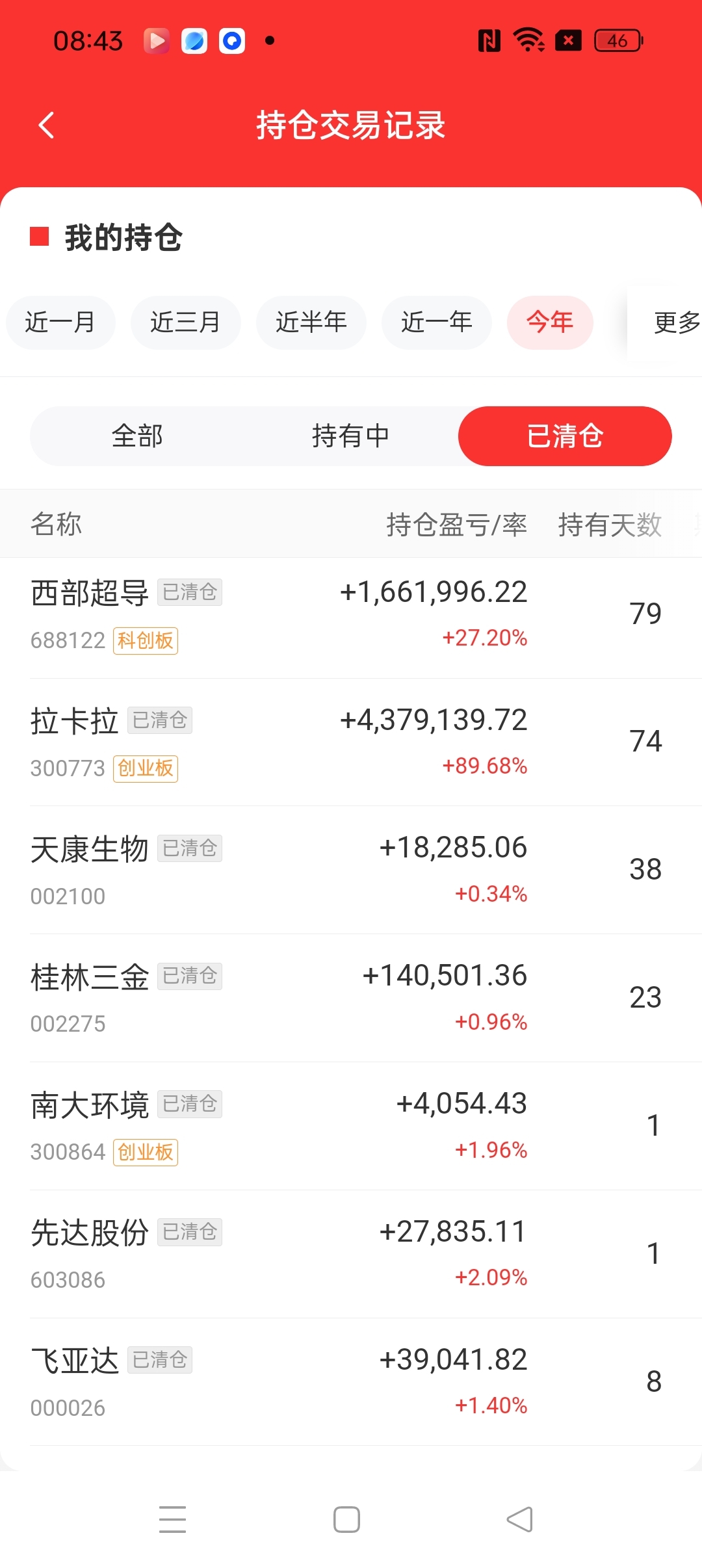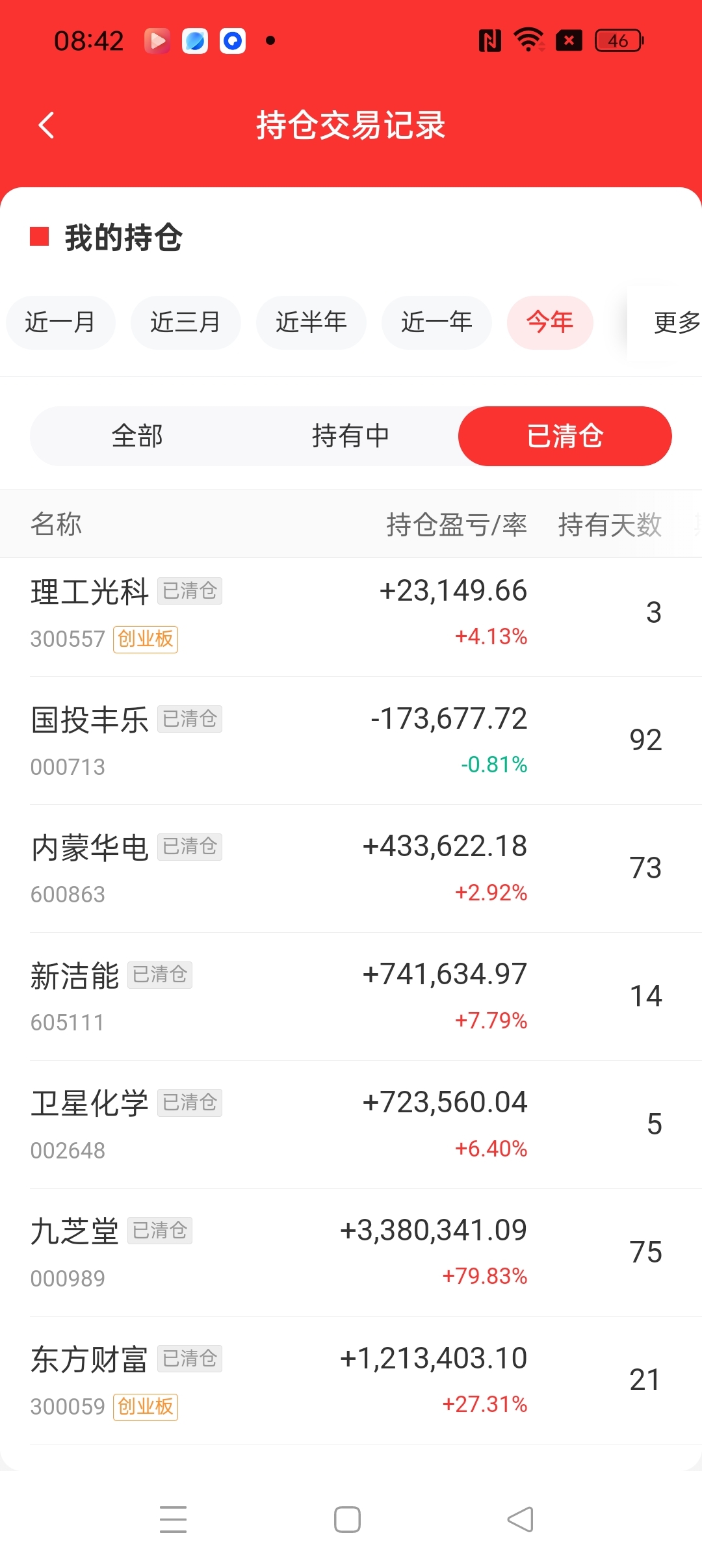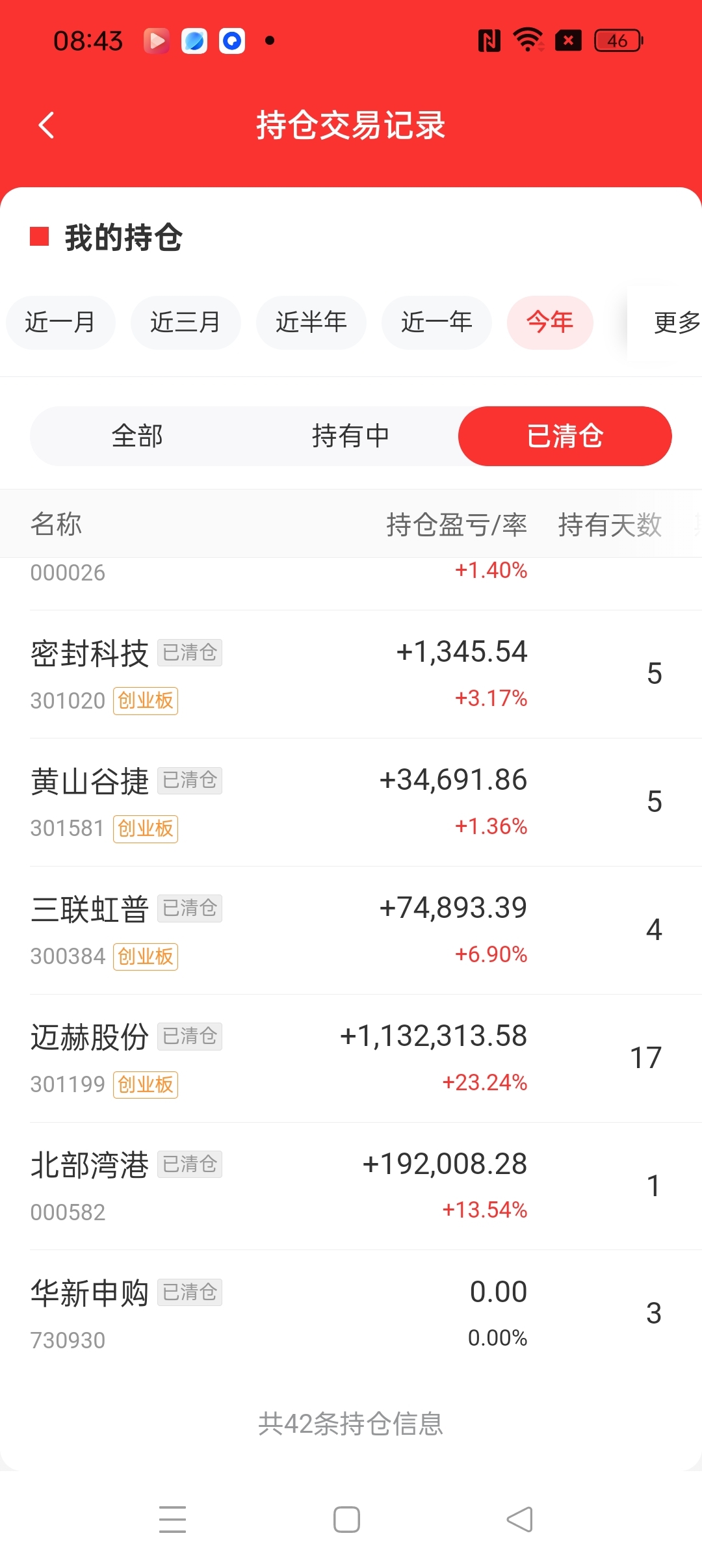 节止上个交易日,今年共清仓了四十二支个股,其中有两支个股亏损状态清仓,四十支盈利