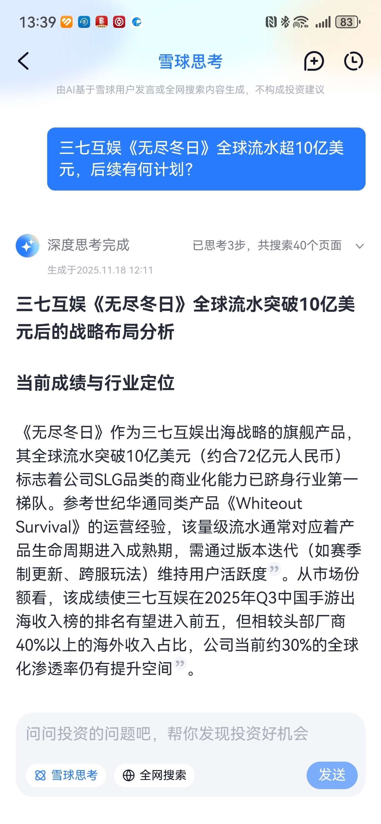 $三七互娱(SZ002555)$ 雪球的AI提问,我也是服了,竟然公开宣传假消息。竟然把无尽冬日说是三七互娱的。