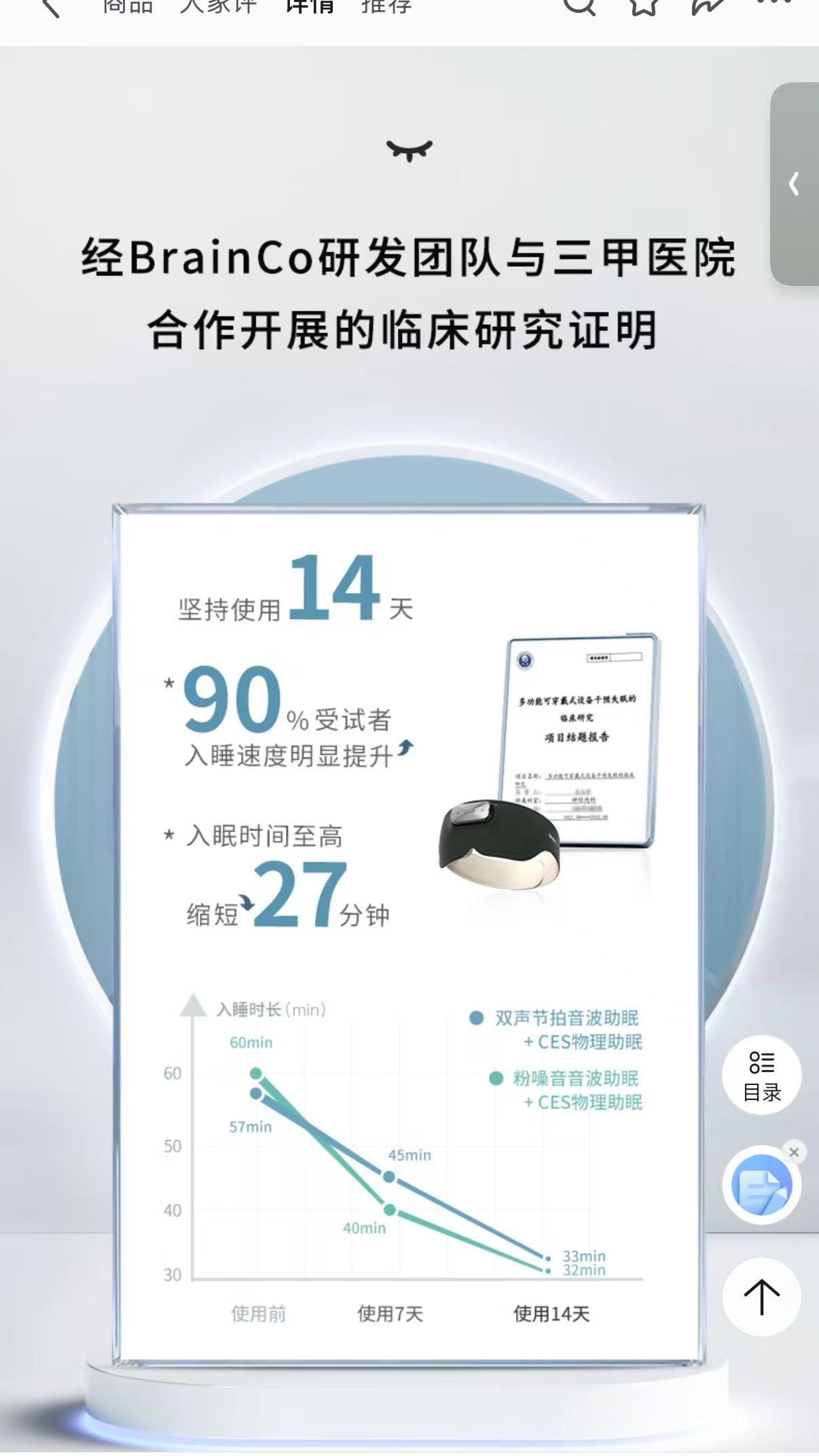 值得注意的是,强脑科技客服一方面表示强调安睡仪为“电子产品”,降低注册审批和监管门槛;另一方面,又在产品推介上宣传其临床试验效果,加强对消费者的购买说服,可谓两相“跨界”,左右逢源。