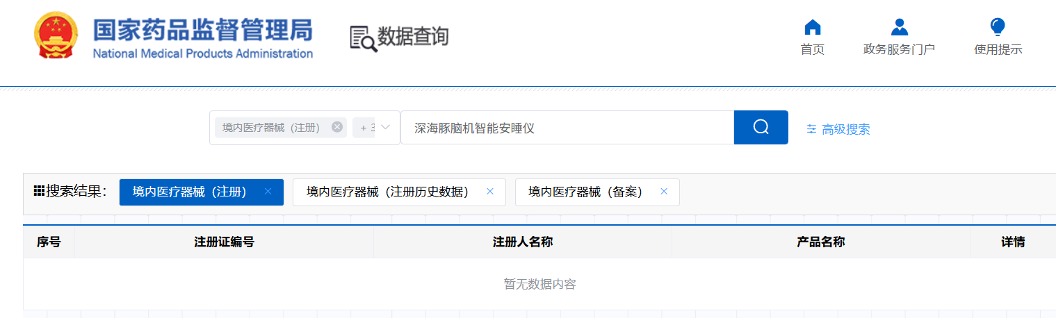 根据《医疗器械分类目录》,睡眠仪属于二类医疗器械。但以该产品名“深海豚脑机智能安睡仪”在国家药品监督管理局官网搜索,却并无医疗器械注册或备案记录。