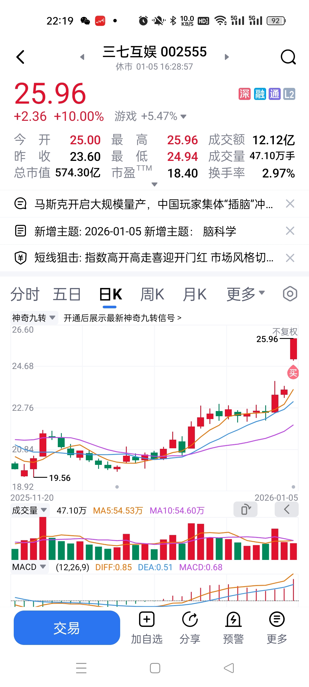 $三七互娱(SZ002555)$ 业绩不错,今天开盘买入一些,大盘也,这次就捂它一段时间了,