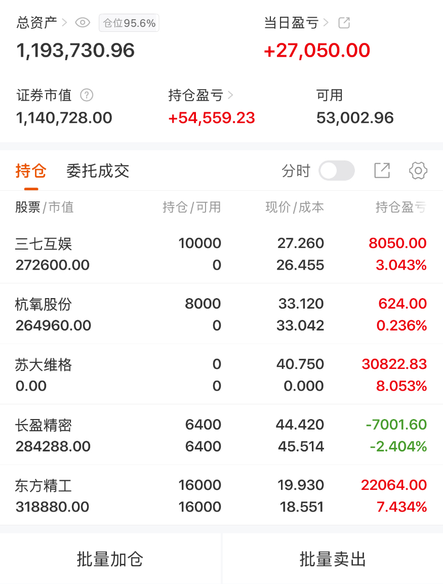 今日:三七互娱--杭氧股份今日:苏大维格今日:+27000