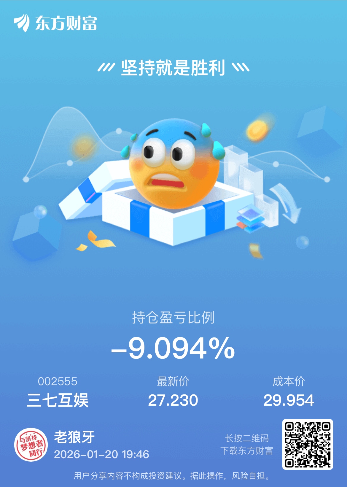 温馨提示: 1.根据《证券法》规定,禁止编造、传播虚假信息或者误导性信息,扰乱证券市场;2.用户在本社区发表的所有资料、言论等仅代表个人观点,与本网站立场无关,不对您构成任何投资建议。用户应基于自己的独立判断,自行决定证券投资并承担相应风险。《东方财富社区管理规定》