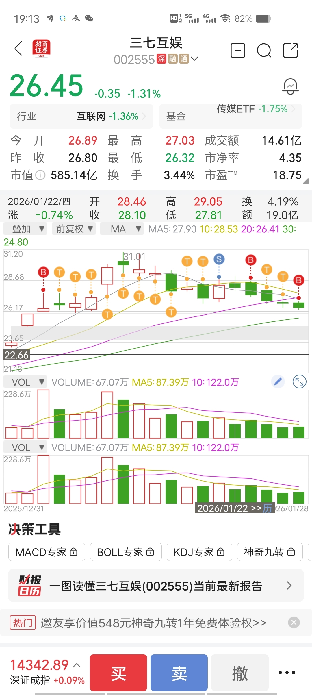 $三七互娱(SZ002555)$ 又回到了我最近1/6 最近一次刚买入的价!1/6 26.46开仓买入2000股,又回到了起始位置,全靠做差价赚了4000多点菜钱!哎,白搞!
