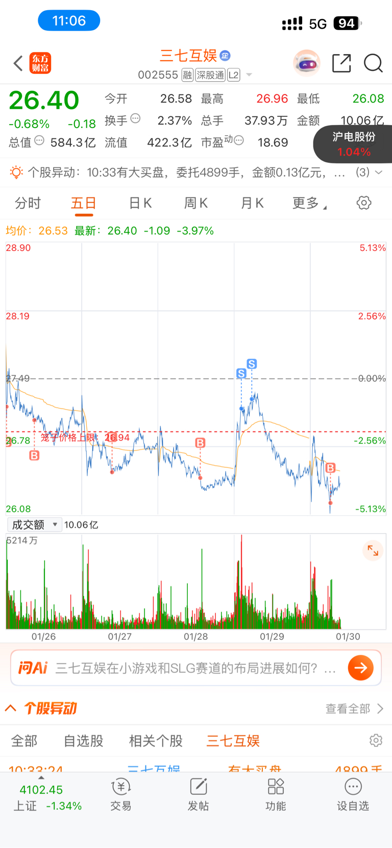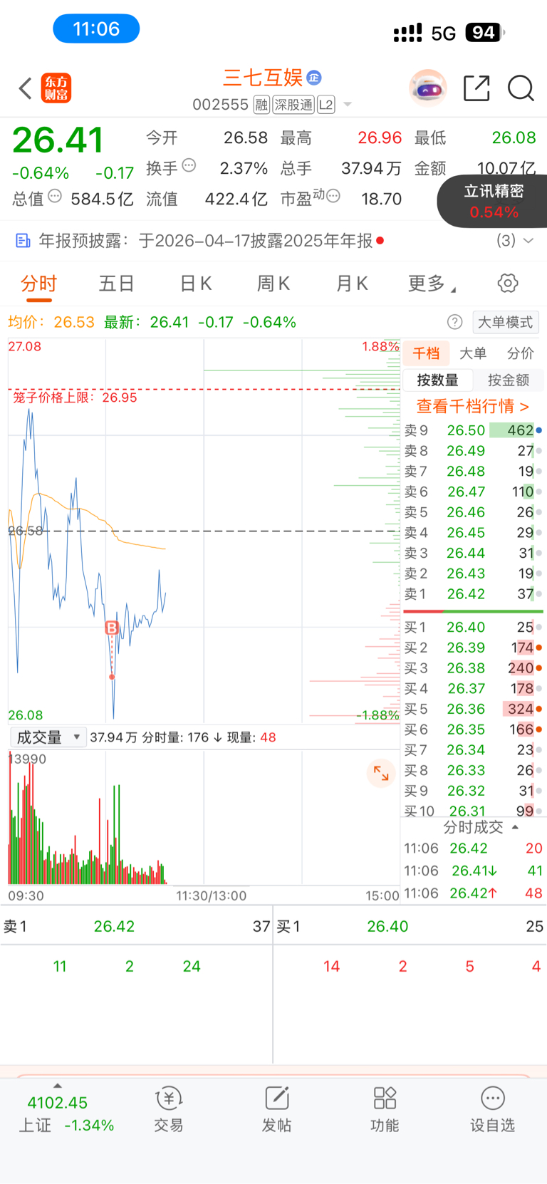 $三七互娱(SZ002555)$ 可惜了还有一笔2602没买到,只T回昨天卖出的一半